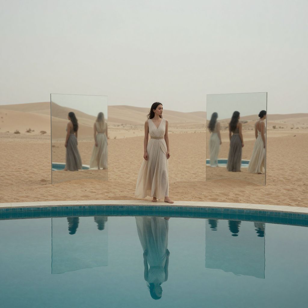 In a desolate desert, a woman in flowing attire stands beside a pool of water, her reflection mirrored not just in the liquid below but also in two standing mirrors that distort reality, revealing ethereal figures and alternate versions of herself, blurring the line between presence and possibility.