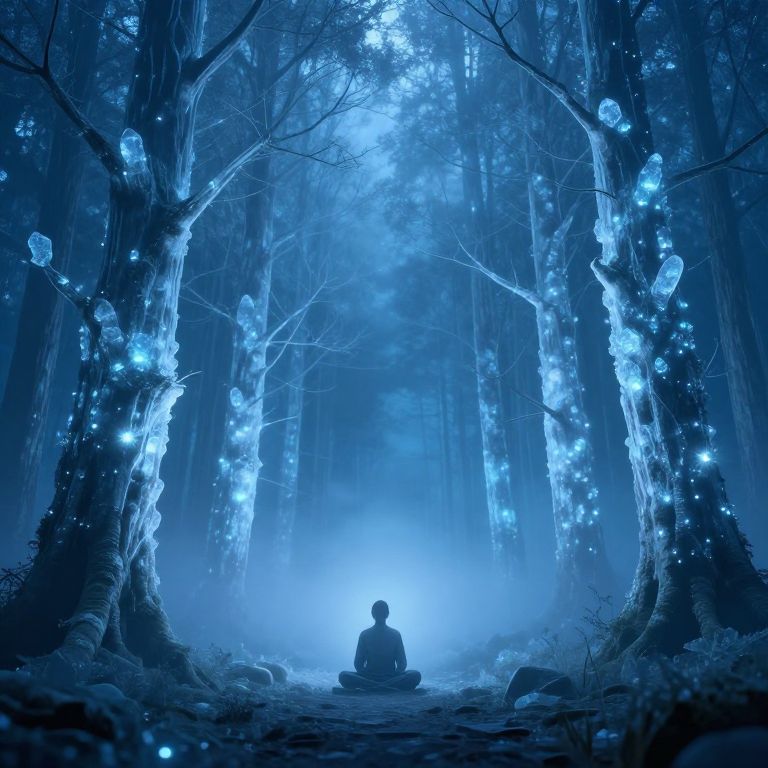 Eonsang meditating in a silent forest of crystalline trees that pulse with bioluminescent light, ambient sound effects implied, ethereal fog, and a dreamlike atmosphere in Dall-E inspired style.