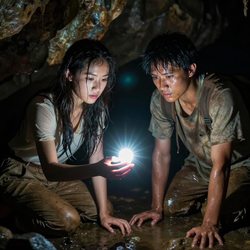 Young Asian woman wearing a white bathrobe over black pants, standing partially hidden between dark, moss-covered, rough rock walls in a dimly lit cave or crevice. She has a concerned expression while gripping one rock wall with her right hand and reaching out with her left. The rocky environment is rugged and uneven with patches of green moss.
