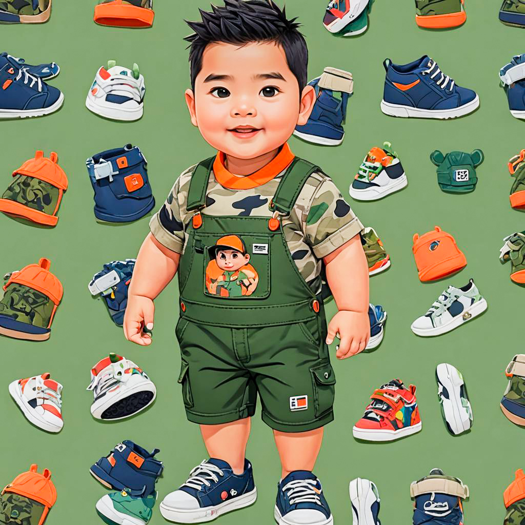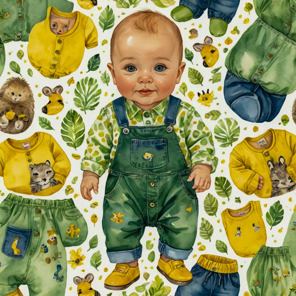 Watercolor illustration of a baby boy with a round tummy and no hair, dressed in a yellow shirt, denim overalls, and yellow slip-on shoes. The background features a pattern of green leaves, small yellow animals, plush toys, and blue shoes, all rendered in a soft, whimsical style.