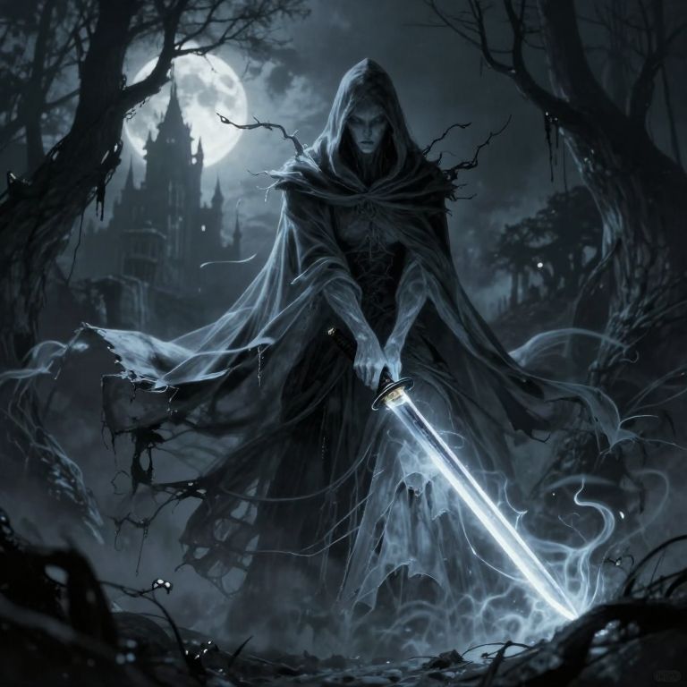 A digital illustration of a dark, hooded figure wielding an ornate scythe. The figure is shrouded in shadows, with only their silhouette and the intricate details of their tattered, spiked armor visible. The scythe's blade is gleaming, adorned with elaborate, star-shaped designs. The background is a misty, black-and-gray gradient, adding a haunting atmosphere. The figure's face is completely obscured, enhancing the mysterious and ominous tone of the image. The overall style is gothic and eerie, with a high contrast of black and white.