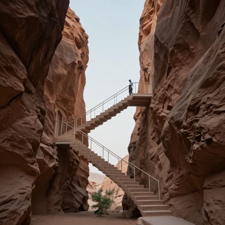 Photograph of a narrow canyon with towering, textured red rock walls. A metal staircase with a handrail stretches diagonally from the bottom center to the top center, connecting the canyon's sides. A solitary figure, silhouetted against the bright sky, stands at the top of the stairs. The canyon floor features a small green plant and a rock. The lighting creates deep shadows, emphasizing the rugged texture of the rock formations. The sky above is a pale blue, contrasting with the warm, earthy tones of the canyon.