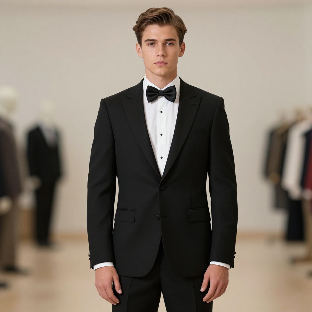 Male ballroom outfit, 1boy, male focus, solo, bow, bowtie, realistic, black pants, shirt, pants, black bow, white shirt, blurry background, looking at viewer, black bowtie, jacket, blurry, formal, tuxedo, suit, black jacket, cowboy shot, long sleeves, standing, collared shirt