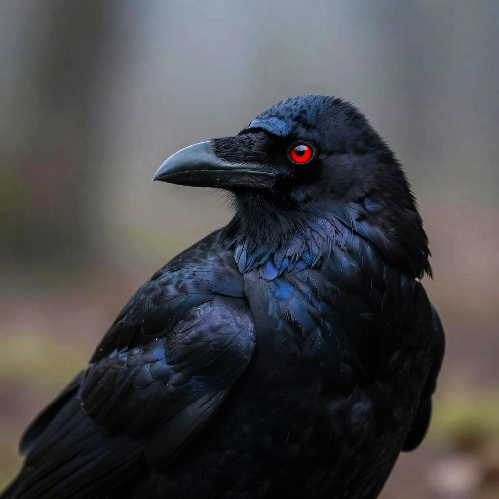 Close-up of a raven with red eyes, feathers glossy black with subtle blue highlights, intense stare with glowing crimson eyes, mysterious foggy forest background, photorealistic style