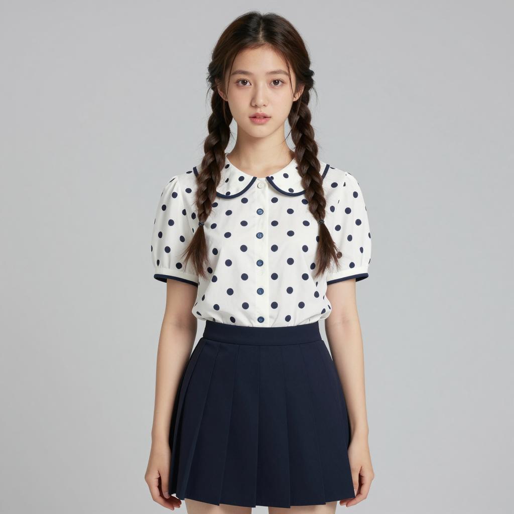 A young woman with long braided hair poses against a plain gray background, wearing a white blouse adorned with navy blue polka dots and trim, paired with a navy pleated skirt. The photo captures a clean, realistic style with soft lighting that highlights her delicate features and natural makeup.