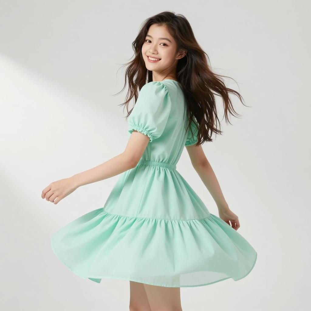 Portrait of a young Asian woman with long braided hair, wearing a white blouse with navy blue polka dots and trim, paired with a navy blue pleated skirt. She poses against a plain gray background in soft, natural lighting, highlighting her delicate features and natural makeup.