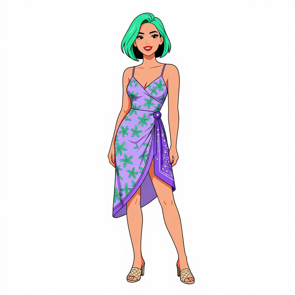 Woman with pretty face and pretty hair. smiling Woman, contemporary casual, asymmetrical slip dress with lavender and green floral print, knee-length with a handkerchief hem, thin spaghetti straps, V-neckline, pair of beige woven mules with low heel, mint green bob hairstyle, plain white studio background. --sref 1467