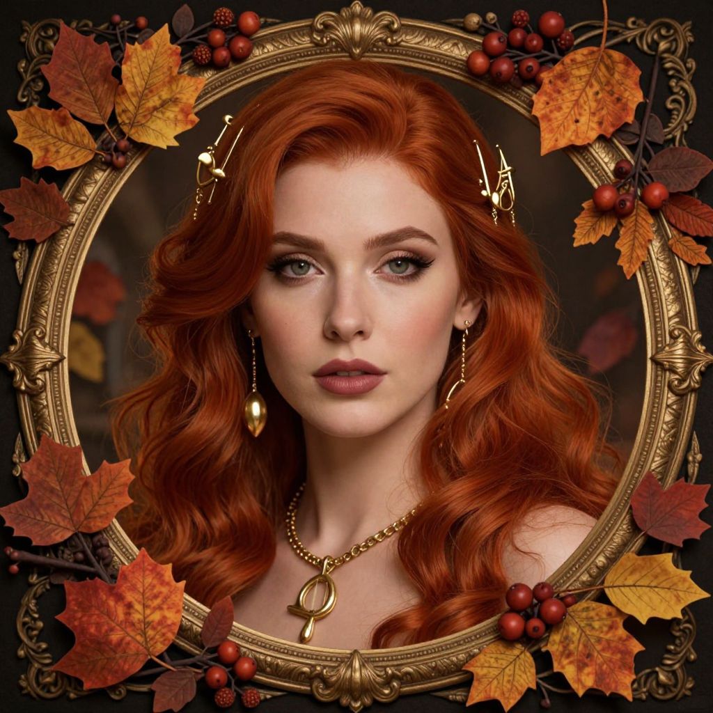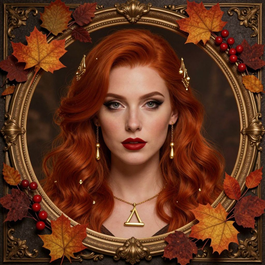 A digitally rendered fine art portrait featuring a woman with vibrant red hair adorned with gold accessories, set against a richly detailed circular frame embellished with autumnal leaves and berries, evoking a luxurious and mystical aesthetic reminiscent of the Libra zodiac sign.