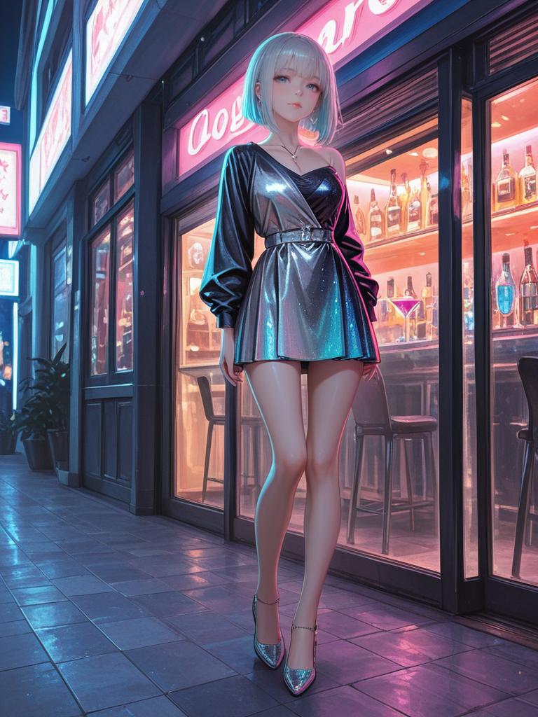 Cyberpunk-style digital art of a silver-haired woman in a shiny black and silver mini dress, standing outside a neon-lit bar.