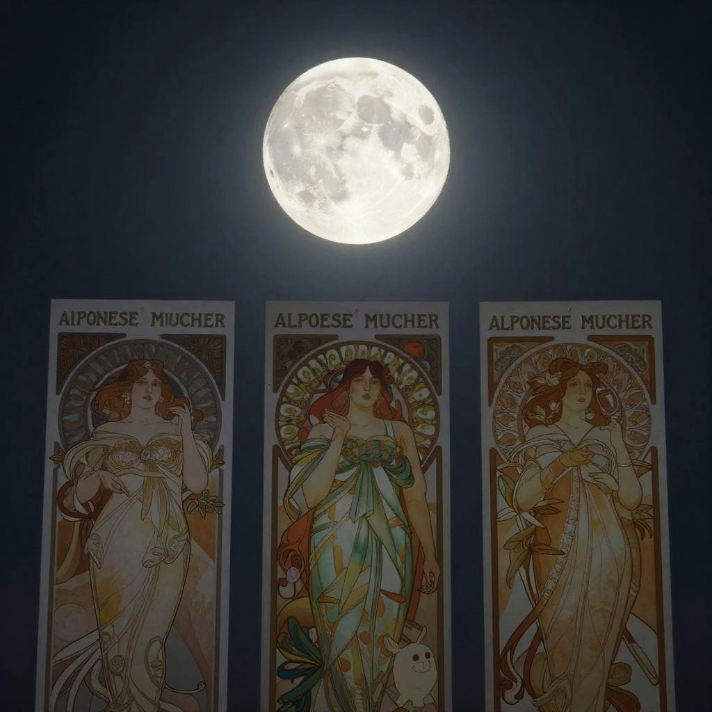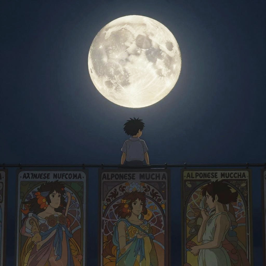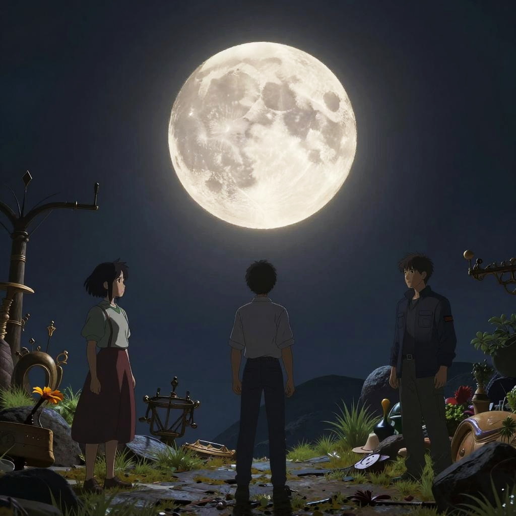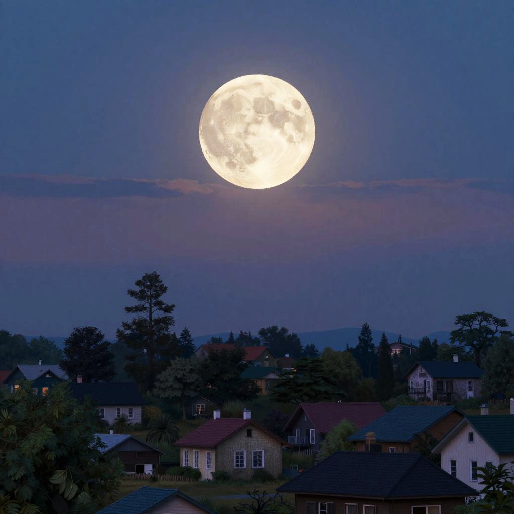 A full moon glowing against a phosphorescent night sky, set in a detailed and intricate environment that fuses styles reminiscent of Ilya Kuvshinov, Greg Rutkowski, Beeple. The scene is illuminated using global illumination techniques, creating a soft yet vivid glow, with atmospheric depth and volumetric lighting effects. Rendered with Unreal Engine, capturing a high-definition, immersive ambiance filled with fine detail and a surreal, artistic quality.