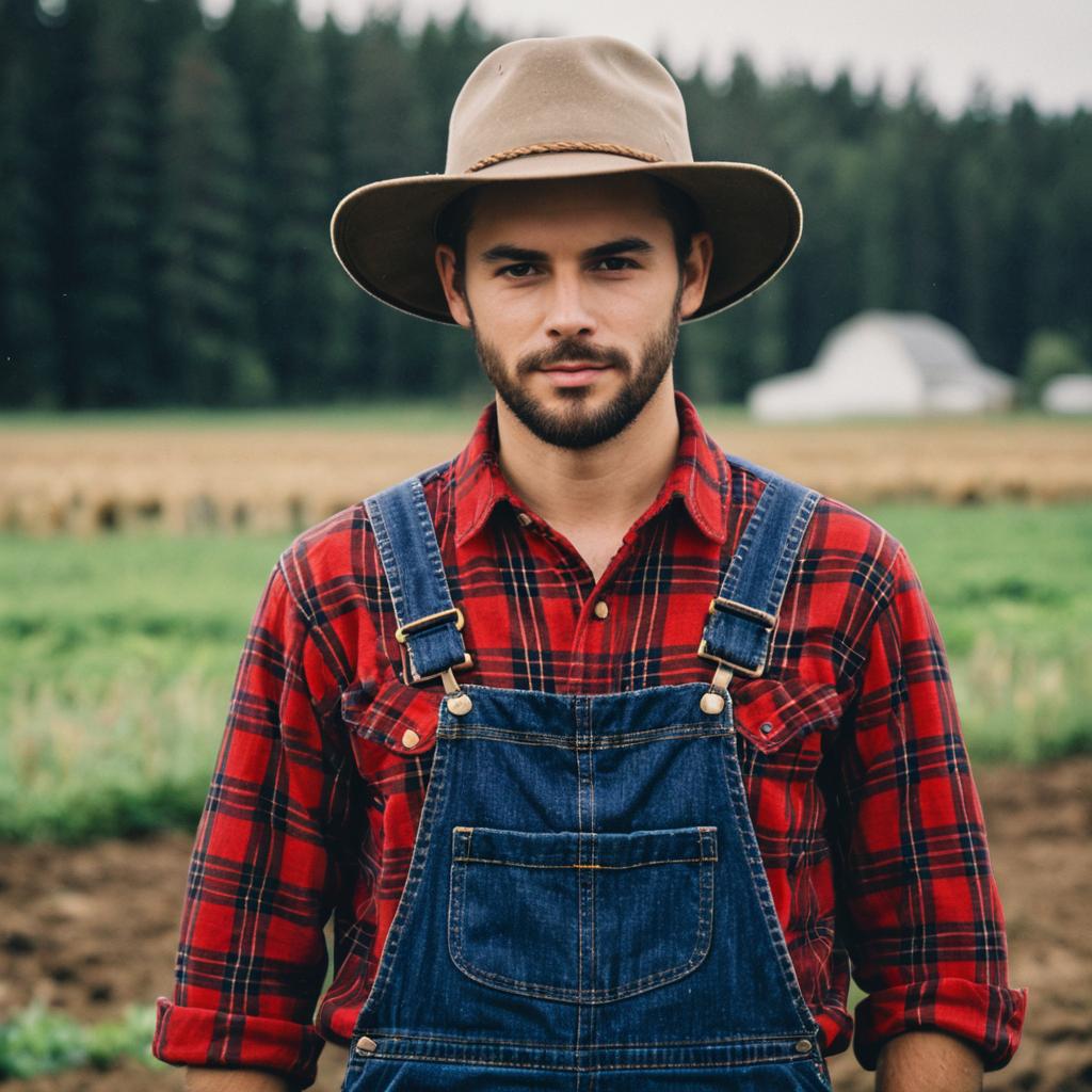Farmer day outfit,1boy, male focus, plaid shirt, realistic, solo, overalls, shirt, outdoors, hat, blurry, blurry background, red shirt, looking at viewer, plaid, collared shirt, day, standing, facial hair