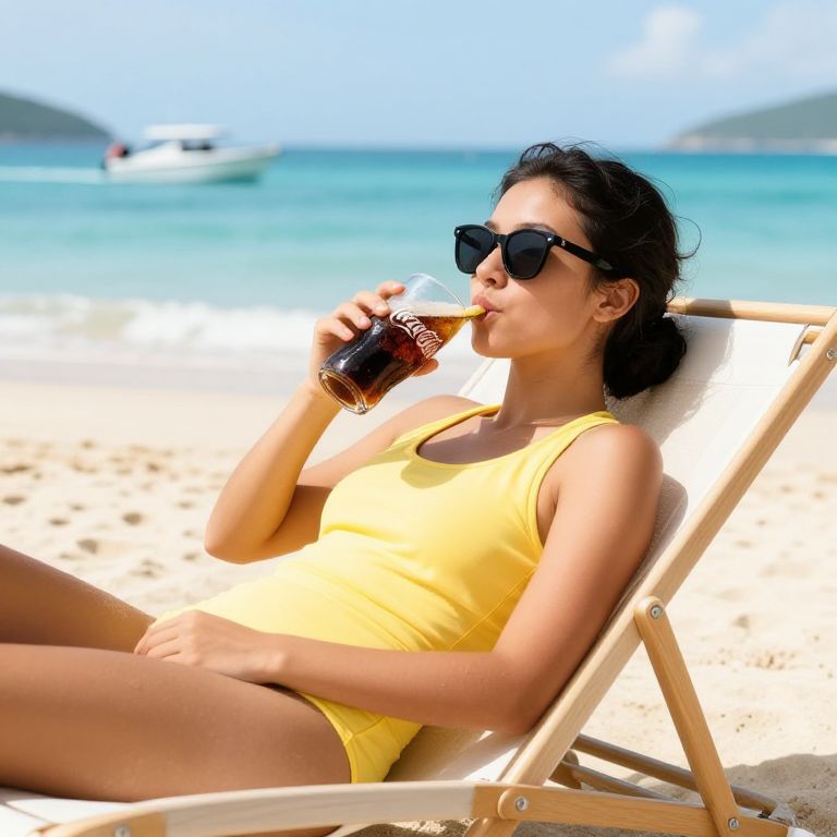 Revelation a banana with sunglasses drinking coca cola in a lounger on the beach where boats are passing by,modern,hyper realistic,