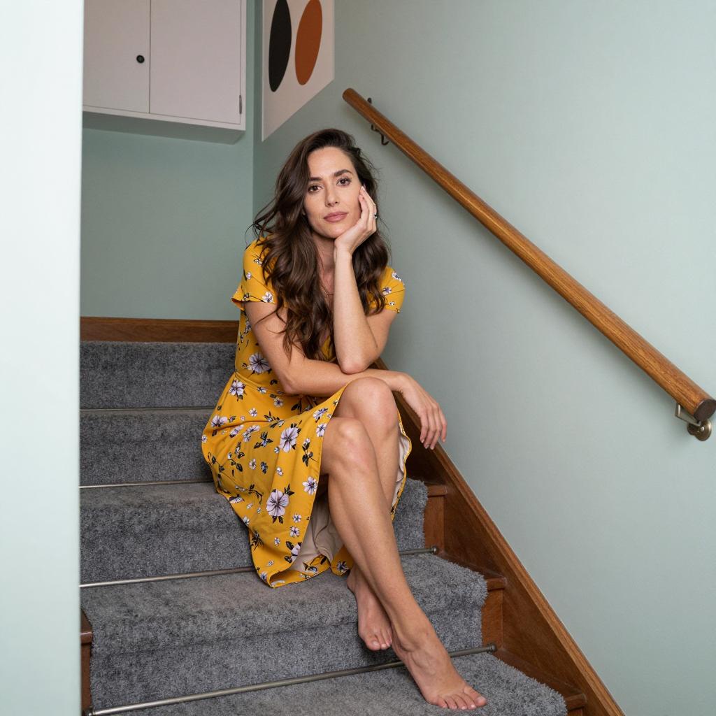 Woman with long brown hair, wearing a yellow floral dress, sitting on gray carpeted stairs, barefoot, right hand on cheek. Wooden handrail on right, light green walls, closed white cabinet above, painted black and orange abstract design on wall.