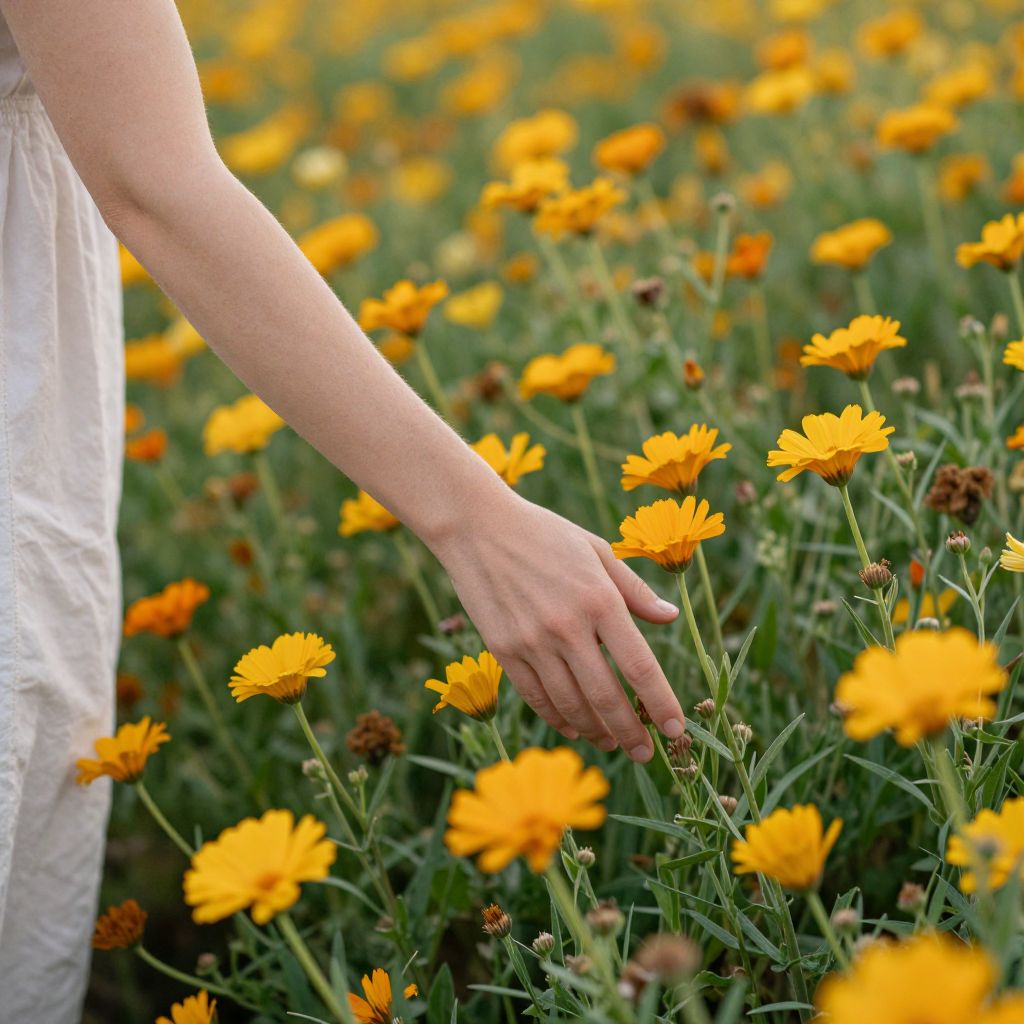 In a field of golden calendula, a woman's gentle touch speaks of harmony with nature, her presence a quiet testament to the enduring cycle of growth and renewal, where the warmth of the sun and the earthy scent of blooming flowers intertwine with a sense of purpose and serenity.