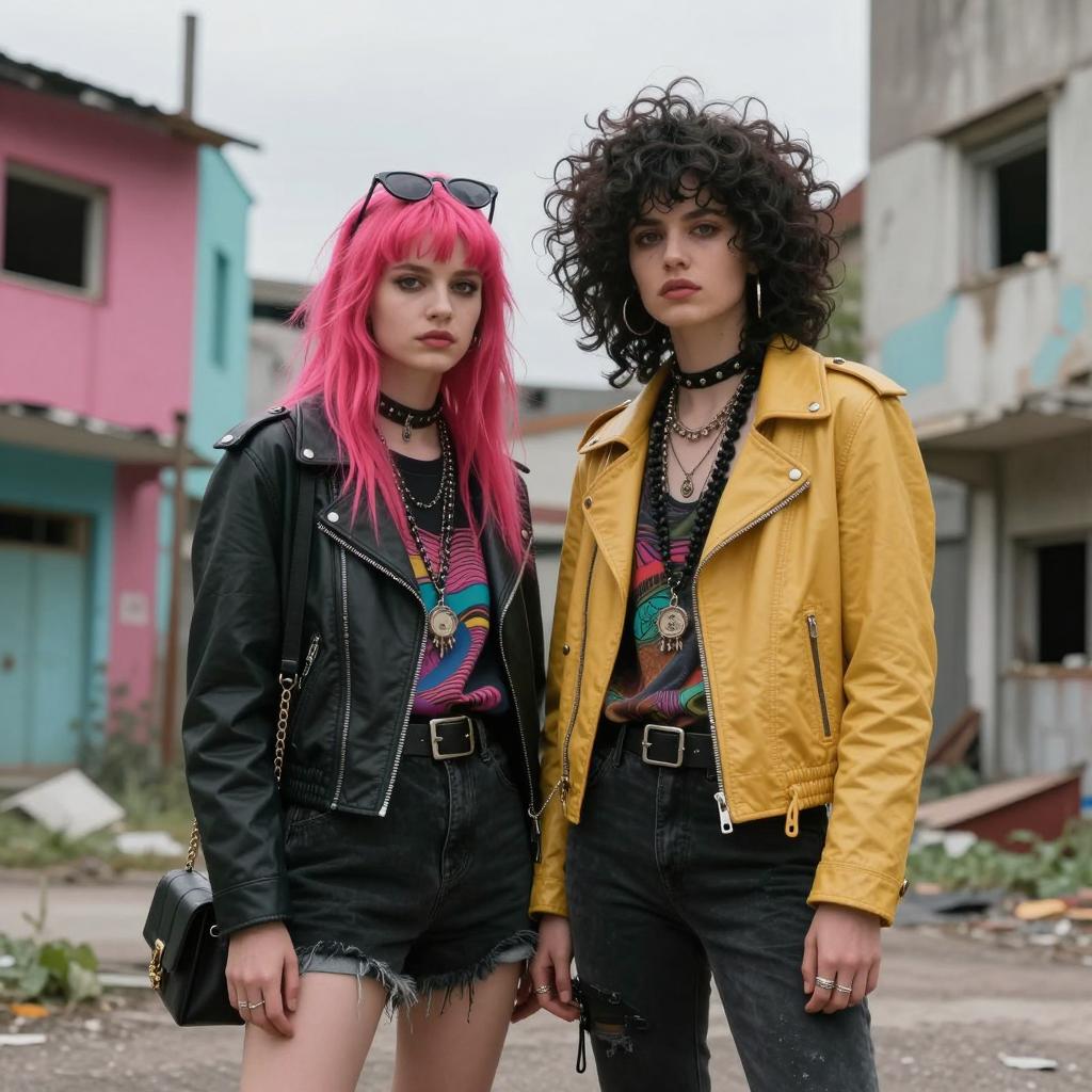Portrait of two young women standing in a dystopian urban environment with a backdrop of decayed buildings and vibrant colors. Both wear bold alternative fashion including leather jackets—one black, one yellow—graphic t-shirts, black denim shorts and jeans, and statement accessories such as layered necklaces and choker collars. One has bright pink hair with sunglasses on her head, the other has voluminous curly black hair. The scene captures a post-apocalyptic, rebellious style.