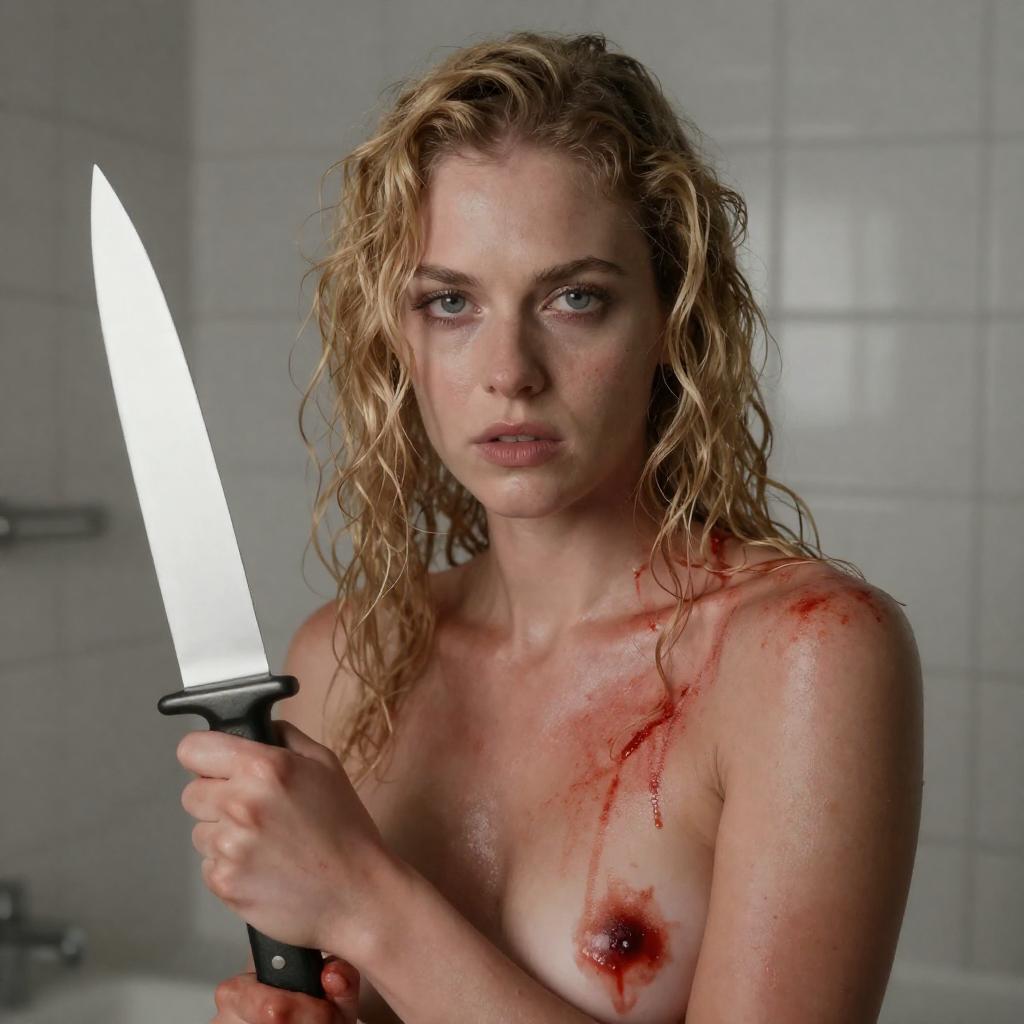 Photograph of a woman with wet, curly blonde hair, holding a large white knife. She has blood on her chest and shoulders, with a focused, intense expression. Background is a tiled wall. She is partially undressed. Knife is angled upward.