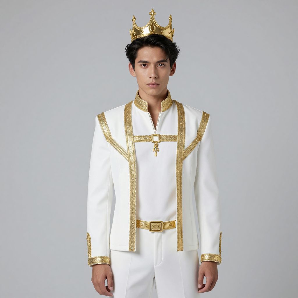Photograph of a young man with dark hair, wearing a white and gold royal outfit, gold crown, and white pants, against a plain light grey