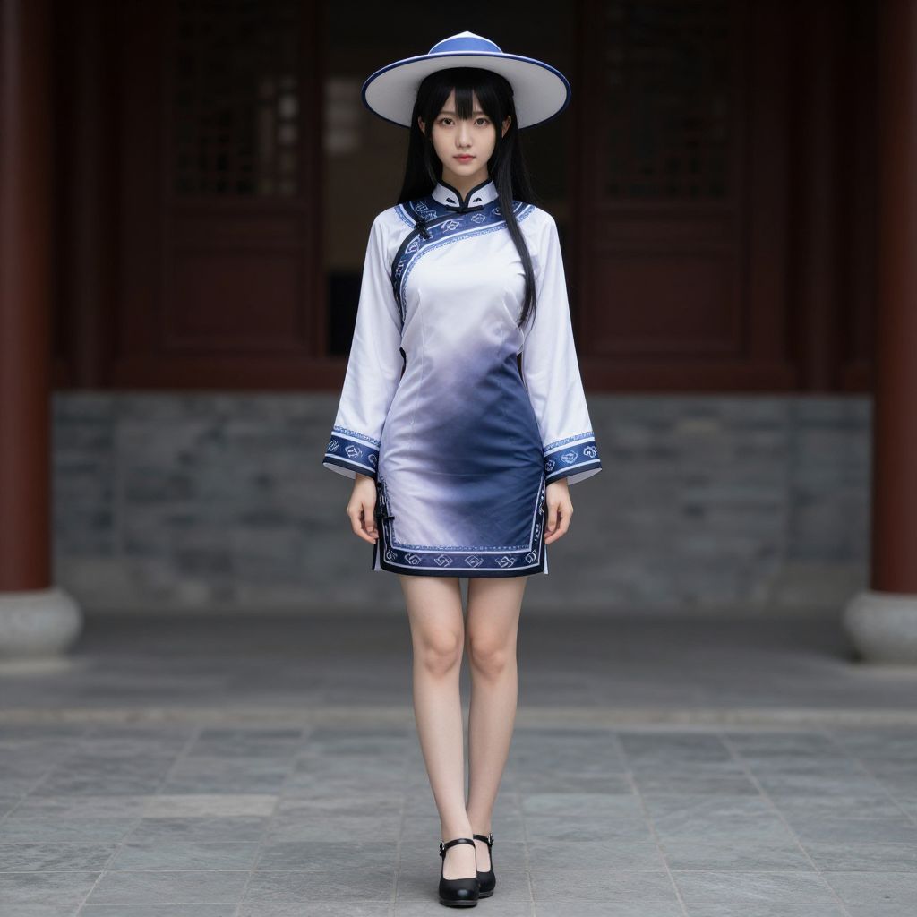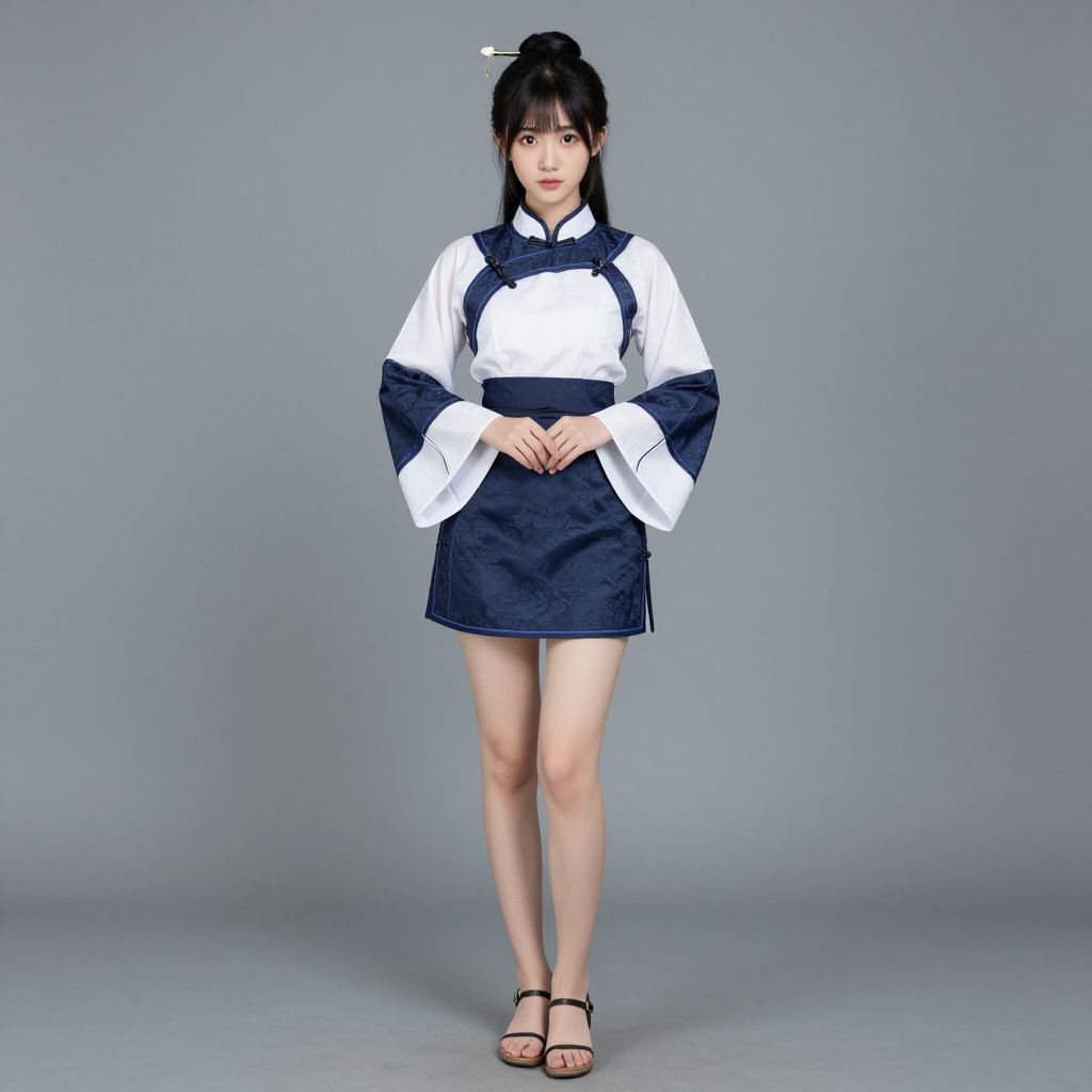 Photograph of an East Asian woman with fair skin, black hair in a bun, wearing a white and navy traditional Korean outfit, standing against a gray