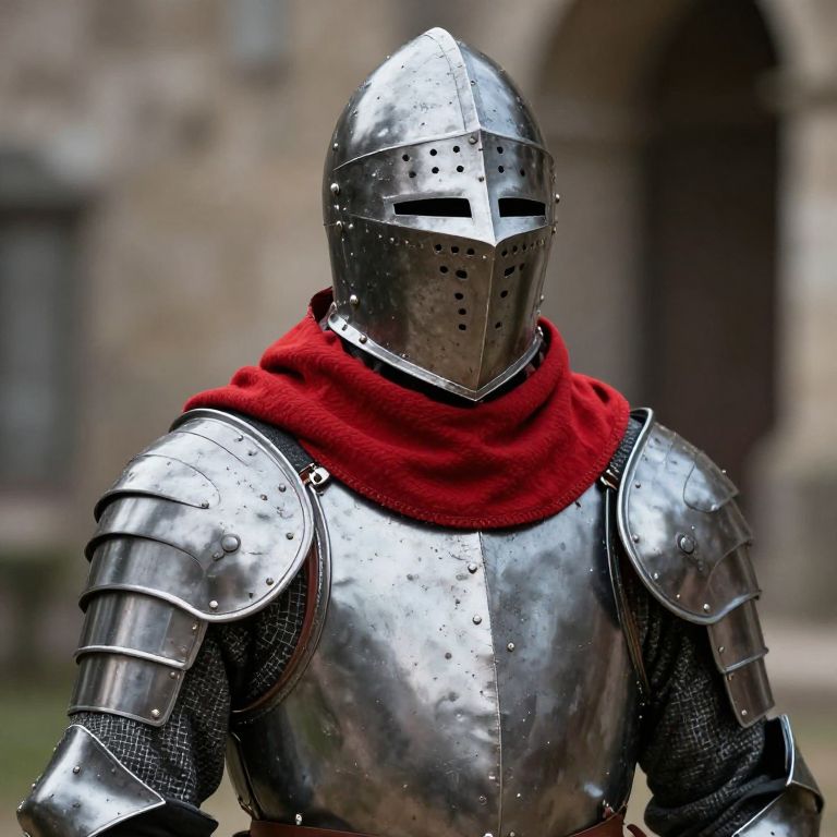A person is wearing a medieval armor with a helmet and a red scarf around their neck.