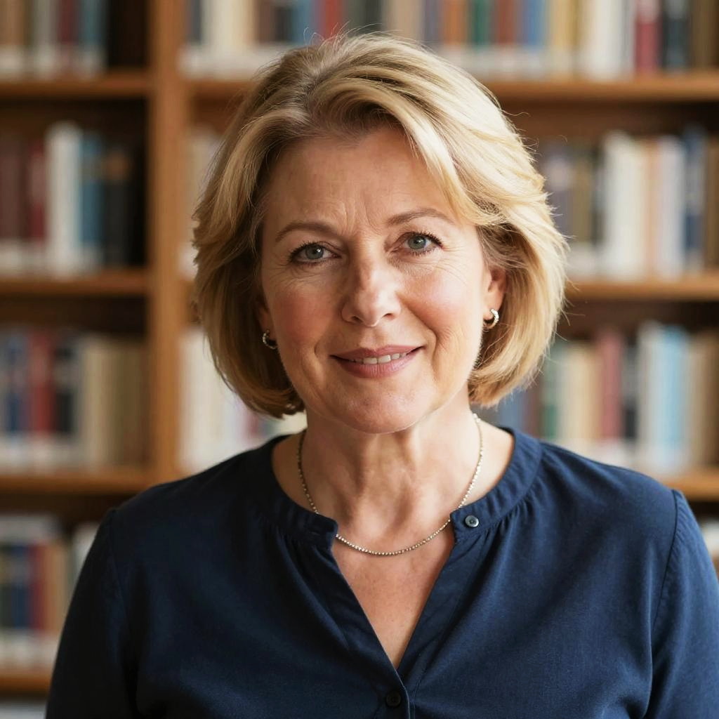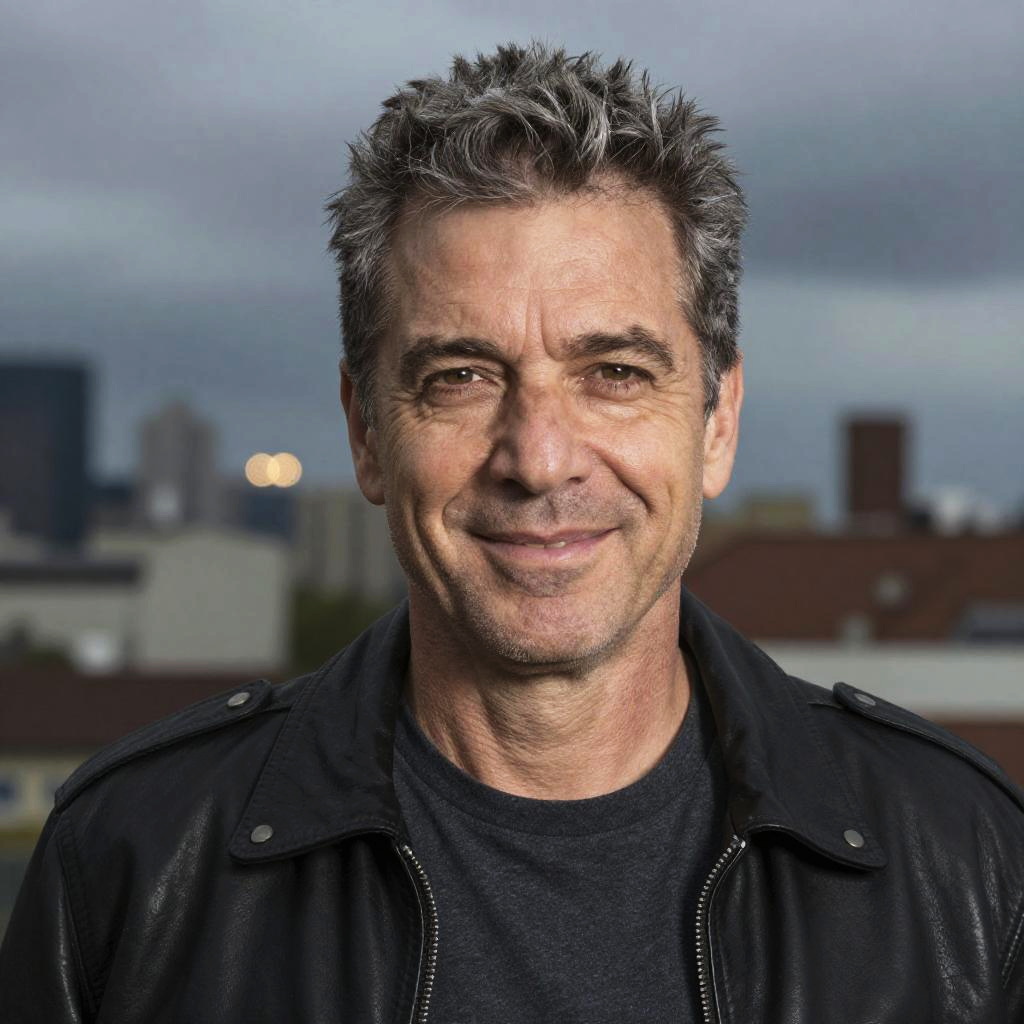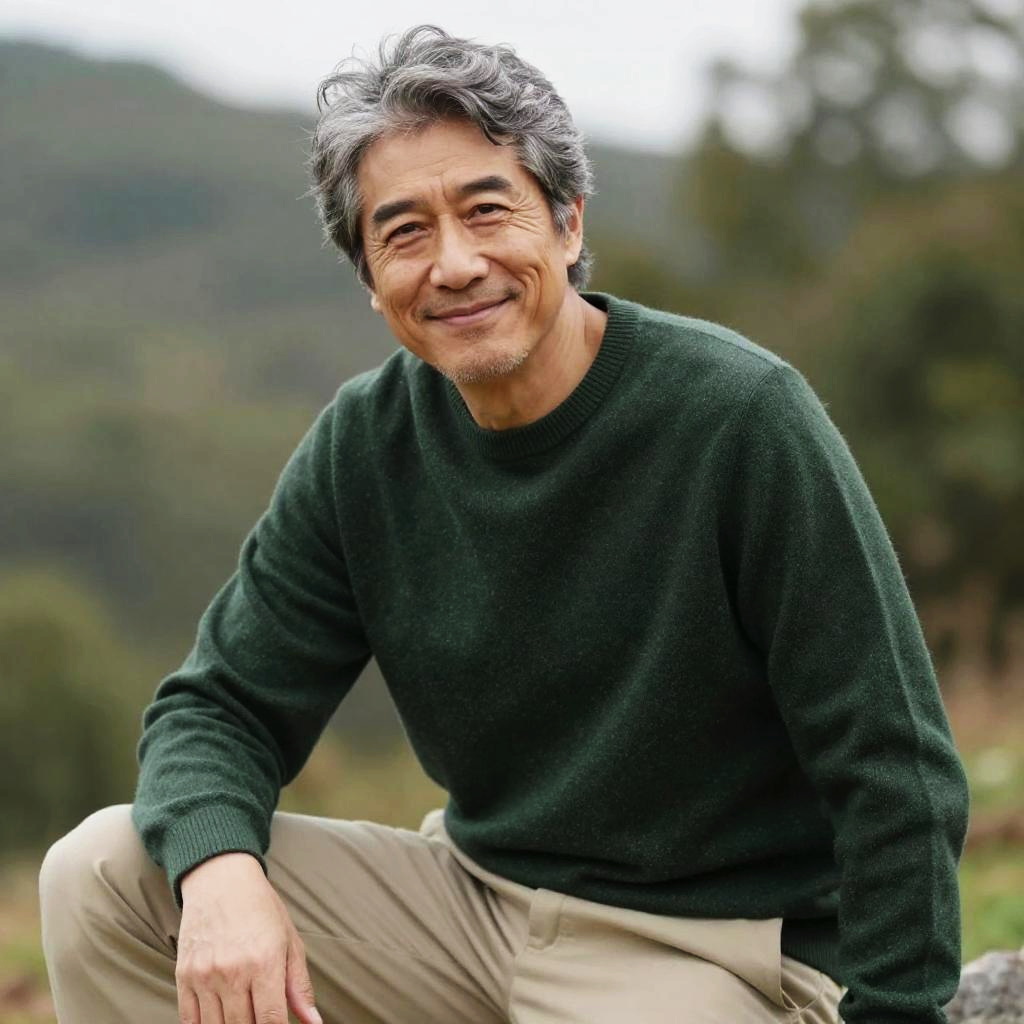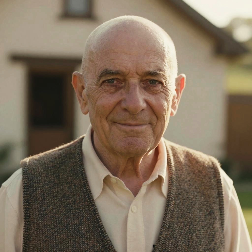 Close-up portrait of elderly man with bald head and glasses wearing dark green pullover and beige slacks, bathed in soft afternoon sunlight with blurred park bench, shallow depth of field, realistic photographic style, friendly inviting vibe.