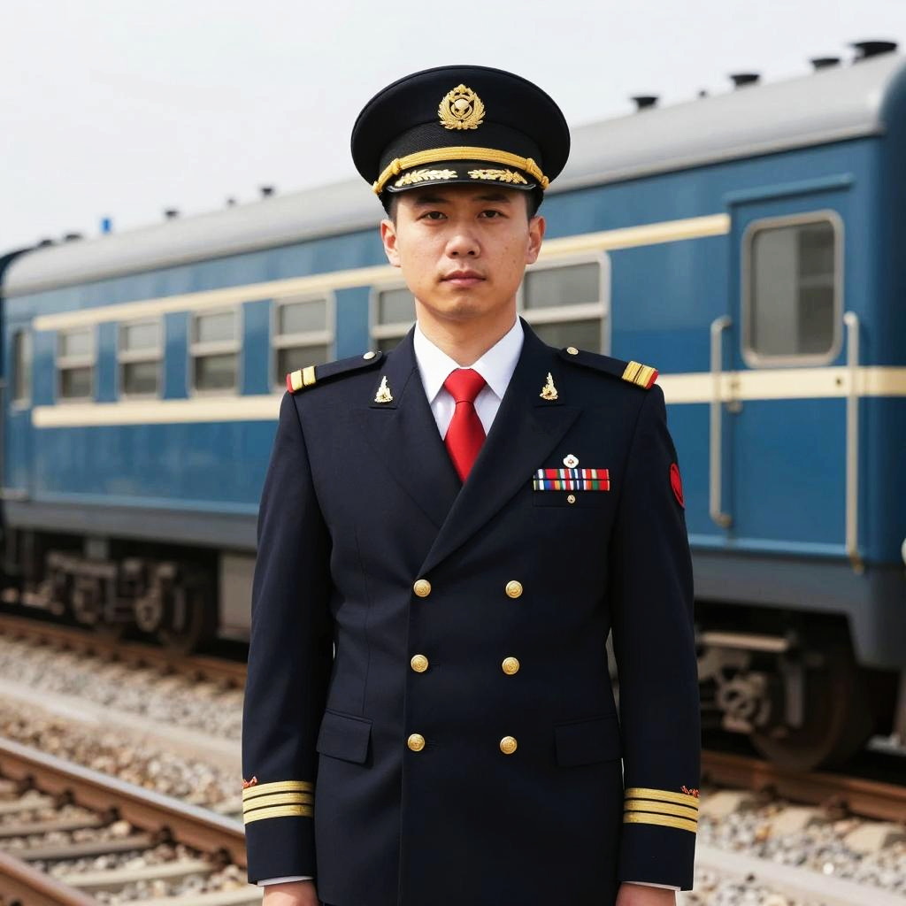 A man dressed in a formal train engineer uniform, featuring a peaked cap, red tie, and decorated with multiple service ribbons. He stands confidently by railway tracks with a classic blue train blurred in the background, presenting a professional and focused demeanor. The photograph has a realistic style with natural lighting and a shallow depth of field to emphasize the subject.