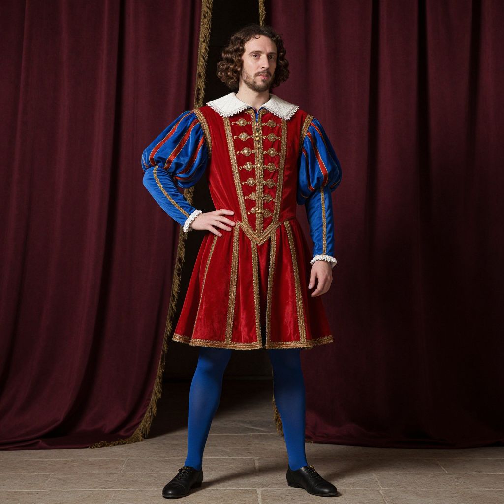 Italian Renaissance Theatre Costume, man in a red and blue costume standing in front of a curtain
