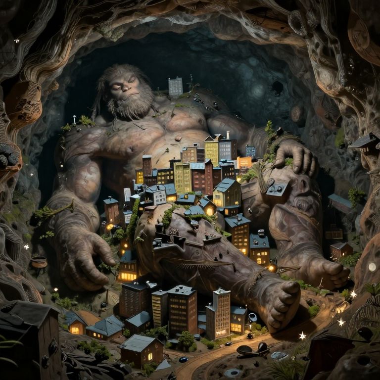 This is a digital fantasy artwork depicting a colossal, muscular, bearded giant with a furry, brown-skinned body, sleeping inside a dark cave. He is surrounded by a miniature city, with brightly lit, yellow-lit buildings and darkened streets, nestled in his massive, outstretched hand. The giant's face, with closed eyes, rests on a larger, elevated platform. The cave's entrance frames the scene, with twisted, vine-like textures. Small trees and plants grow around the buildings, adding to the surreal, oversized contrast between the giant and the tiny city. The image has a dark, dramatic color palette with deep blues and blacks, highlighting the illuminated city.