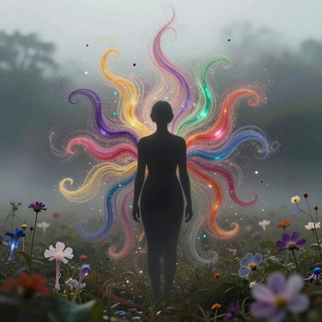 Orgasum inspired image showing a burst of colorful energy waves emanating from a silhouette, amid a misty, surreal landscape featuring delicate, luminous flora and sparkling, swirling particles.