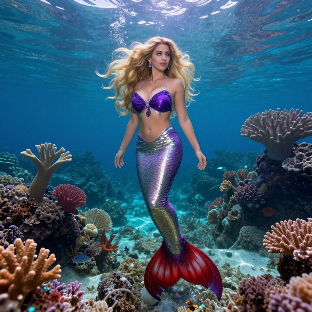 Photorealistic digital artwork of a beautiful mermaid with long, wavy blonde hair, wearing a purple sequined bikini top and a shimmering, purple-to-red gradient mermaid tail. She floats gracefully underwater, surrounded by colorful coral reefs and various marine life. Sunlight filters through the clear blue water, highlighting the textures of the corals and the mermaid's scales. Her expression is serene, and her large, expressive eyes gaze forward. The underwater scene is vibrant, with detailed coral formations in the foreground and a gentle blue gradient in the background.