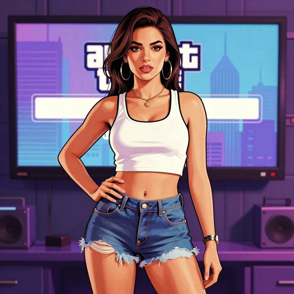A stylish digital illustration of a fictional young woman posing confidently, inspired by the art style of GTA 5 loading screens, featuring bold lines, vibrant colors, and a sleek urban backdrop in a comic book style.