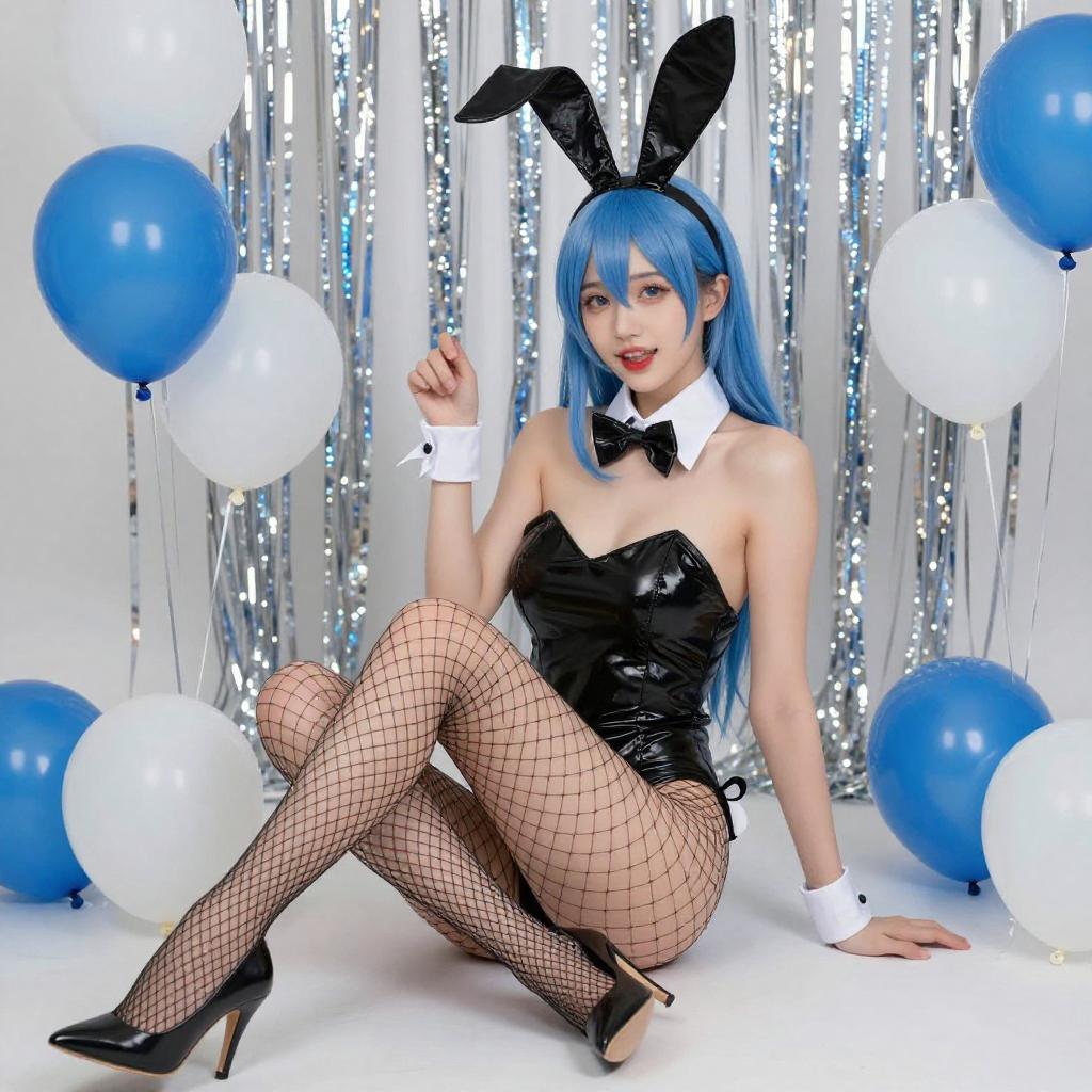 A digital CGI image of a blue-haired woman in a black bunny costume with white trim, black fishnet stockings, and black high heels. She sits with legs spread, wearing black bunny ears and a white collar. The background features silver streamers and blue and white balloons. Her expression is playful, with red lipstick and a slight smile.