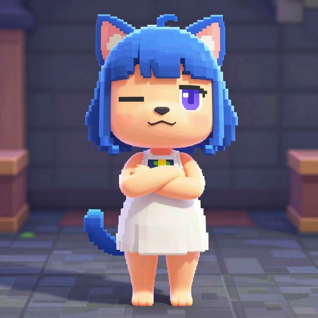 Masterpiece, best quality, ultra-detailed, illustration, epic lighting, cinematic composition, pixel, pixel art, catgirl, ankha (animal crossing), cute, (yellow skin:1.1), small breasts, blue cat tail, cat ears, (short blue hair:1.1), bangs, hair ornament, (purple eyes, glowing eyes:1.2), seducing gaze, captivating pose, barefoot, standing, legs apart, (wide hips, thick thighs:1.1), (half-closed eyes:1.1), expressionless, (crossed arms:1.1), (white dress:1.3), bare thighs, (looking at viewer:1.1), (8k:1.1)
