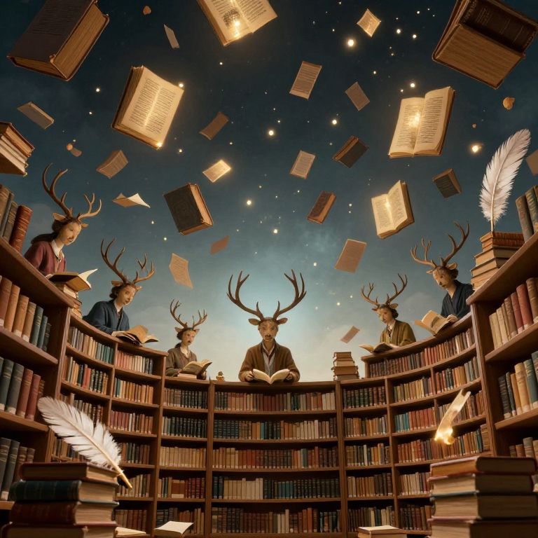 Photograph-like digital illustration: Five people, all with deer antlers, stand behind curved wooden bookshelves filled with books. They wear formal clothing; one central figure is in a suit. The background is a starry night sky with glowing, floating books. White feathers are scattered, one on the lower left and one on the lower right. The scene is illuminated by the warm light of the floating books, creating a magical, whimsical atmosphere. The composition emphasizes a mystical library setting.