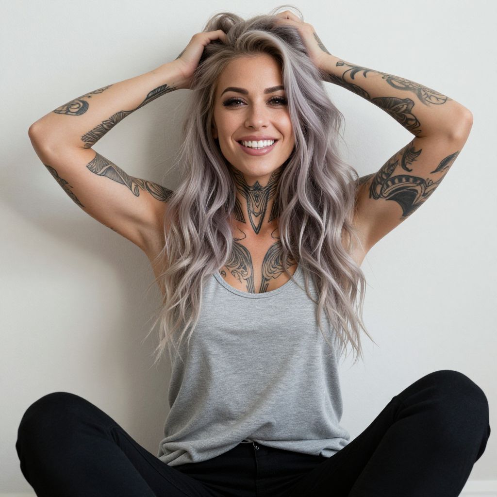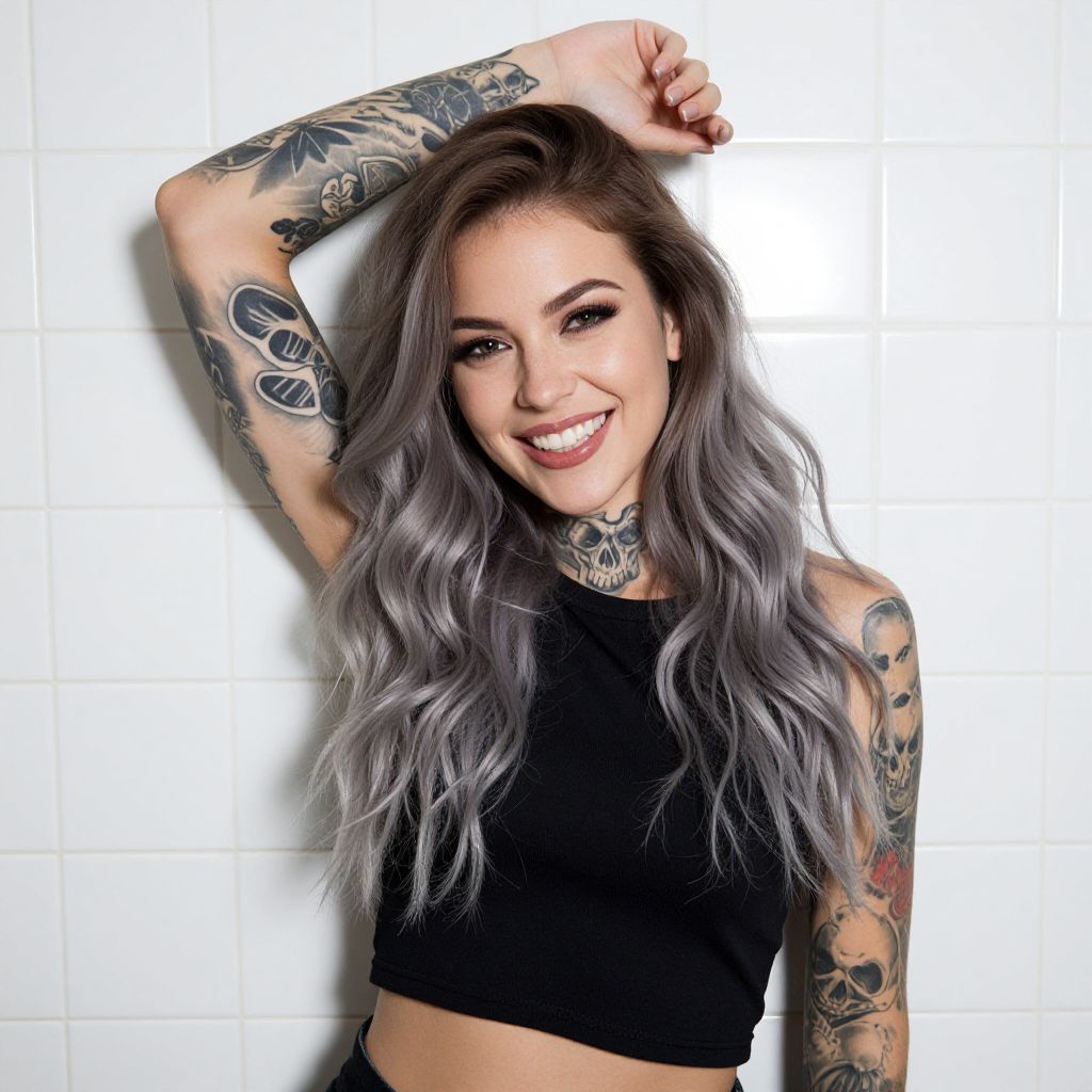 Photograph of a smiling young woman with long, wavy, silver-gray hair. She's wearing a black crop top and has extensive black and gray tattoos covering both arms, including a large skull design. She's standing against a white tiled wall, with one arm raised and her hand touching her hair. Her expression is confident and playful. The lighting is bright, highlighting her tattoos and hair.