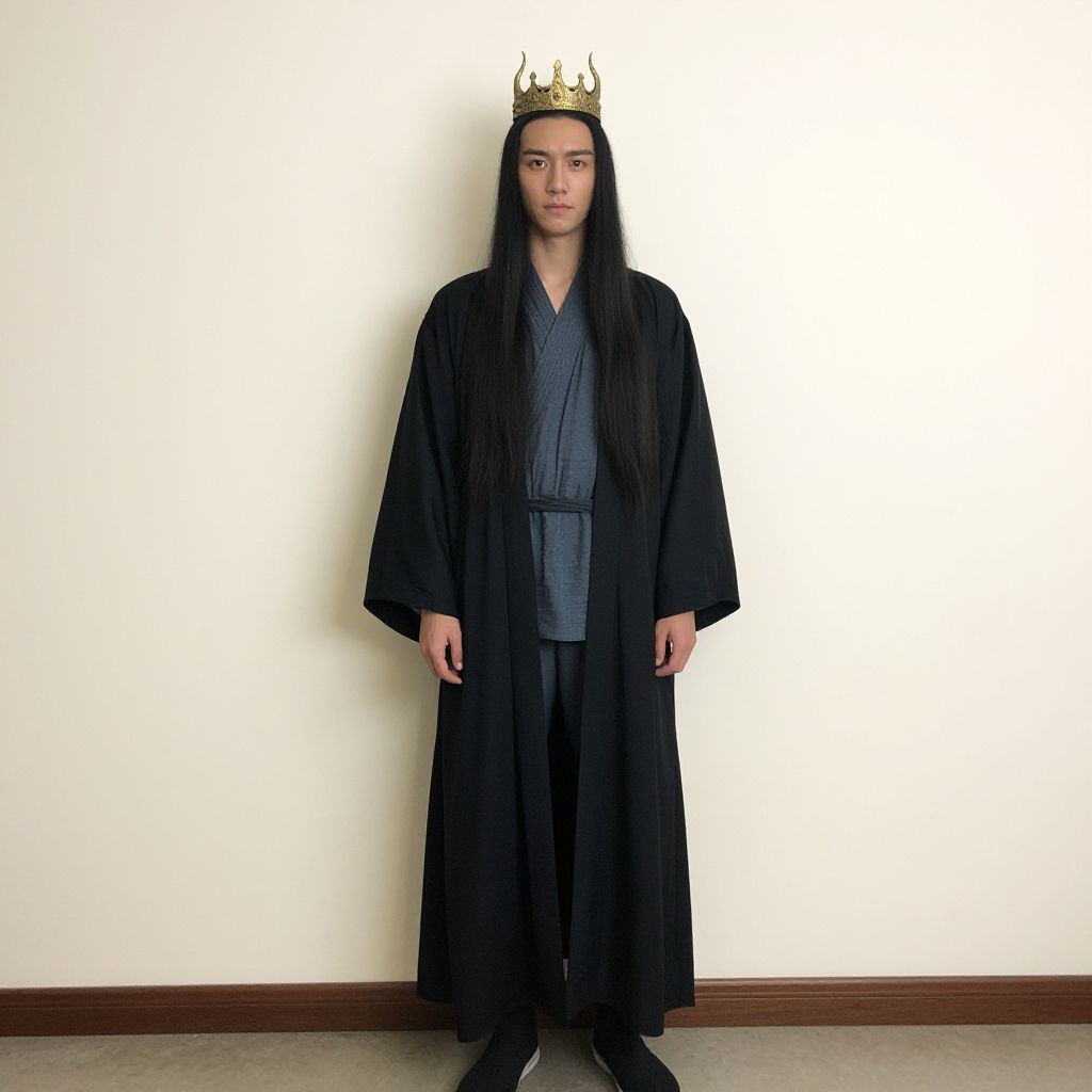 Photograph of an Asian male wearing a white and gold royal robe with crown, standing against a plain grey wall, white sneakers.