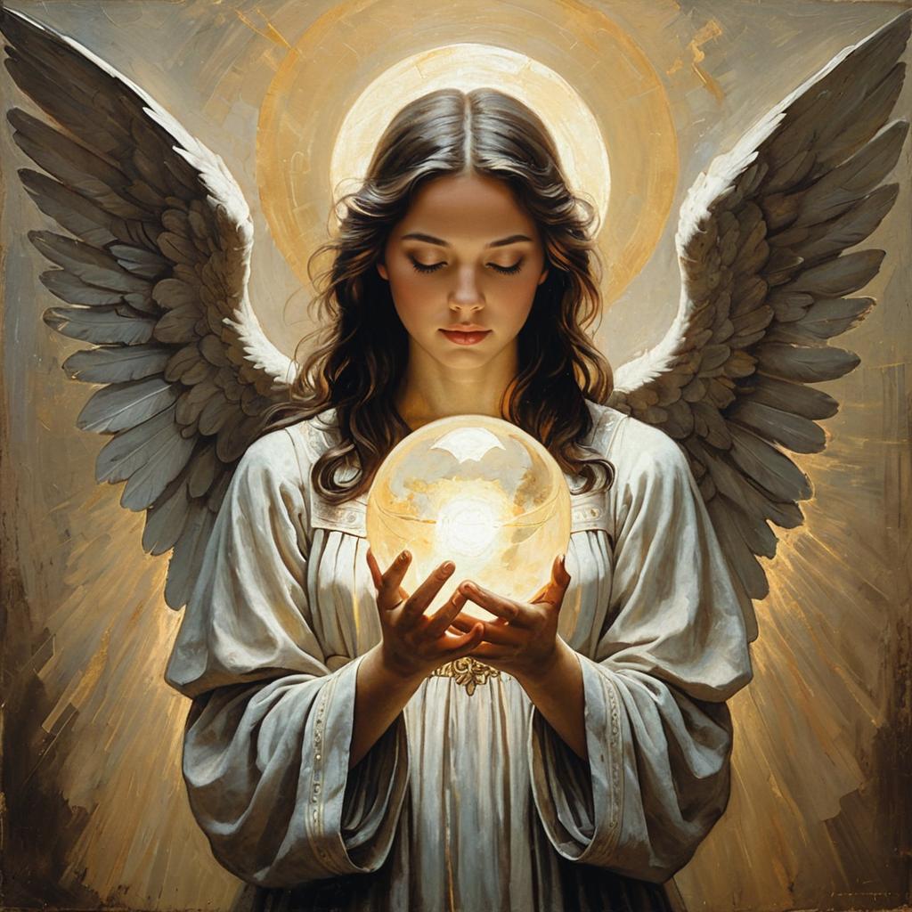 An oil painting of an elegant angel playing a harp, styled with delicate brushwork and shimmering tones. Warm lighting, rough edges, neutral backdrop, religious and emotional composition