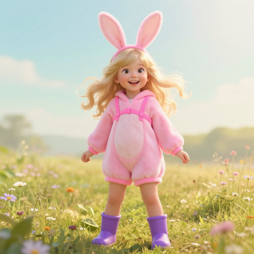 A beautiful young girl with long, flowing blonde hair that gently dances in the breeze, wearing a vibrant pink bunny costume featuring soft pink accents and oversized, fluffy bunny ears that add to her playful charm. Her expression is joyful, with a bright, cheerful smile and wide, sparkling eyes that convey innocence and excitement. She stands confidently in a sun-drenched meadow, where golden sunlight filters through the grass, casting warm, soft shadows and creating a whimsical, dreamlike atmosphere. Matching purple boots complete the outfit, adding a stylish and elegant contrast to the bright pink ensemble. The slight breeze lifts her hair and the fabric of her costume, giving the scene a dynamic, lively feel. The background features a gentle gradient of pastel greens and blues, with wildflowers and dappled sunlight enhancing the overall sense of peace and fun.