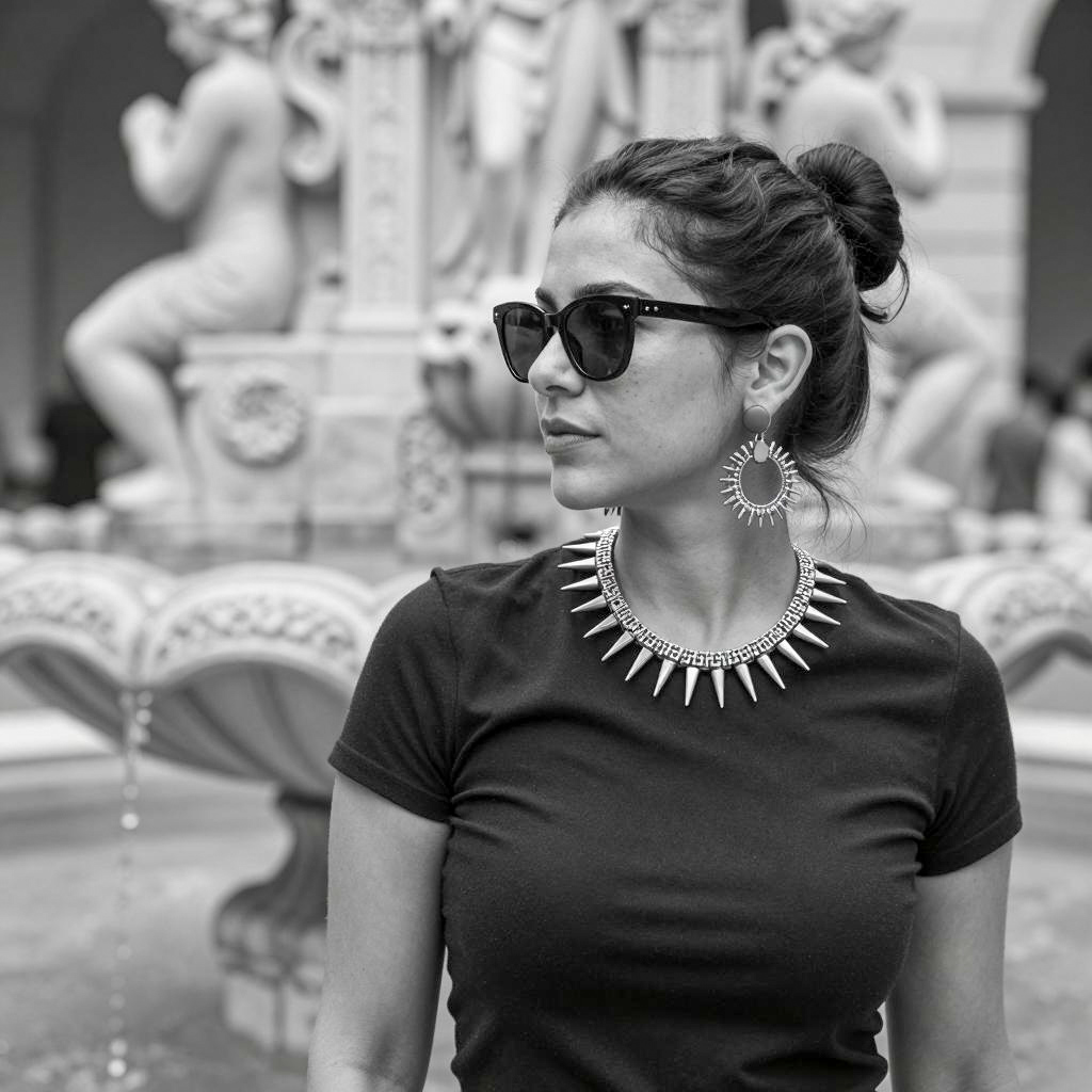 Black and white photo of a woman with long, wavy hair wearing large hoop earrings and dark sunglasses. She holds a thin chain with her right hand. She wears a white, sleeveless satin dress. She stands in front of a ured stone wall with horizontal metal bars. Her head is turned to the left, looking slightly away from the camera. Her expression is neutral.