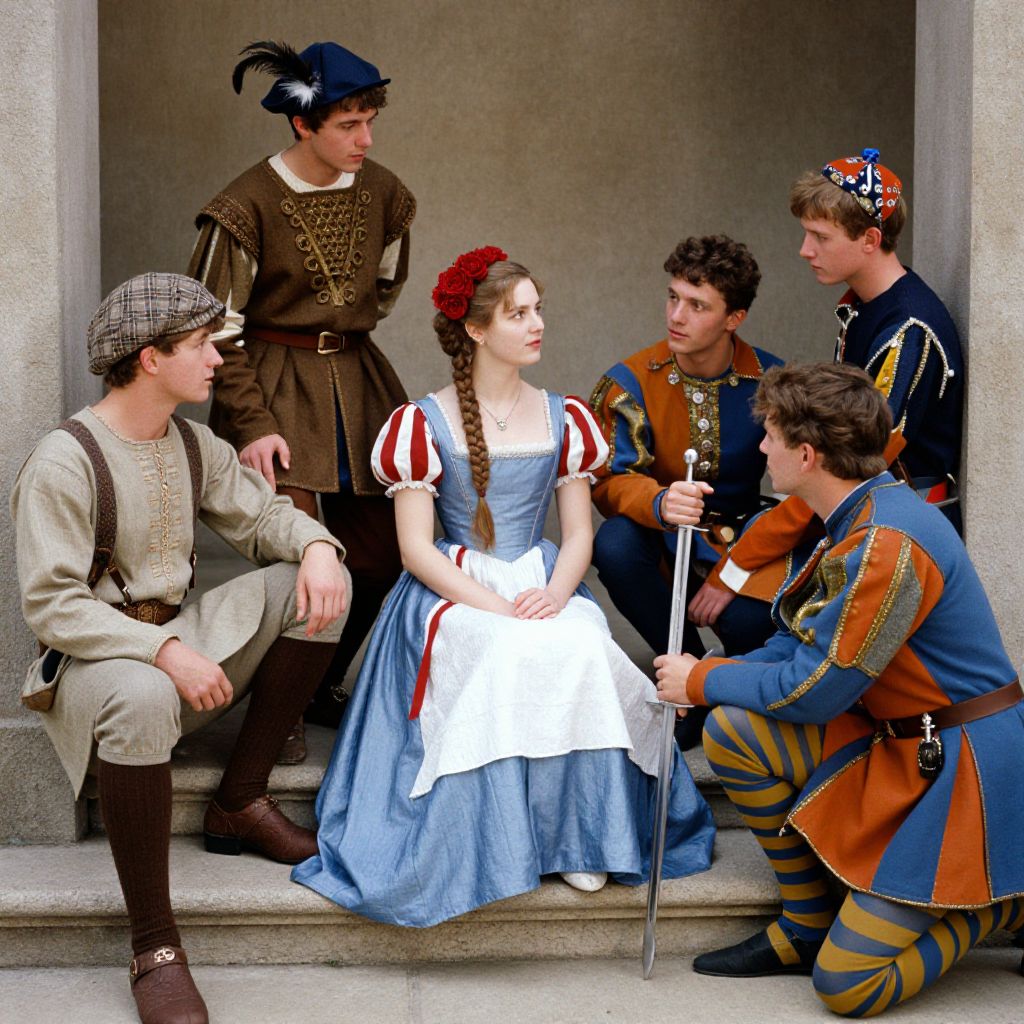 In the 1920s, a group of young people dressed in elaborate medieval costumes engage in live-action role-playing (LARP). The central figure, a woman, sits on a step, adorned in a blue and white dress with red and white puffed sleeves, her hair styled with red roses and braids. To her left, a man in a beige tunic with brown suspenders and a plaid cap sits with his legs crossed, while another man in a brown tunic with a feathered hat and a blue cap stands behind her. To the right, two men in blue and orange tunics with gold accents and striped stockings kneel on the steps, one holding a sword. The background features a textured wall, and the overall scene is bathed in the vibrant colors of Kodak film, capturing the historical ambiance and the detailed craftsmanship of the costumes.