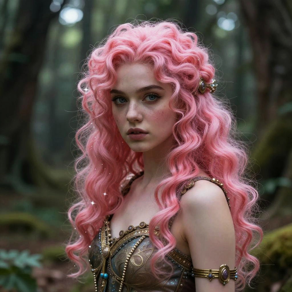 Fantasy character with bright pink curly hair, enchanted forest setting, sparkling highlights, mystical aura, detailed textures, magical realism