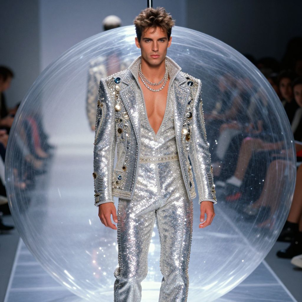 A man in a glittering, intricately detailed outfit stands inside a sheer, glowing clear ball at a 1996 Galliano mens fashion show, evoking an 80s Vogue runway aesthetic.