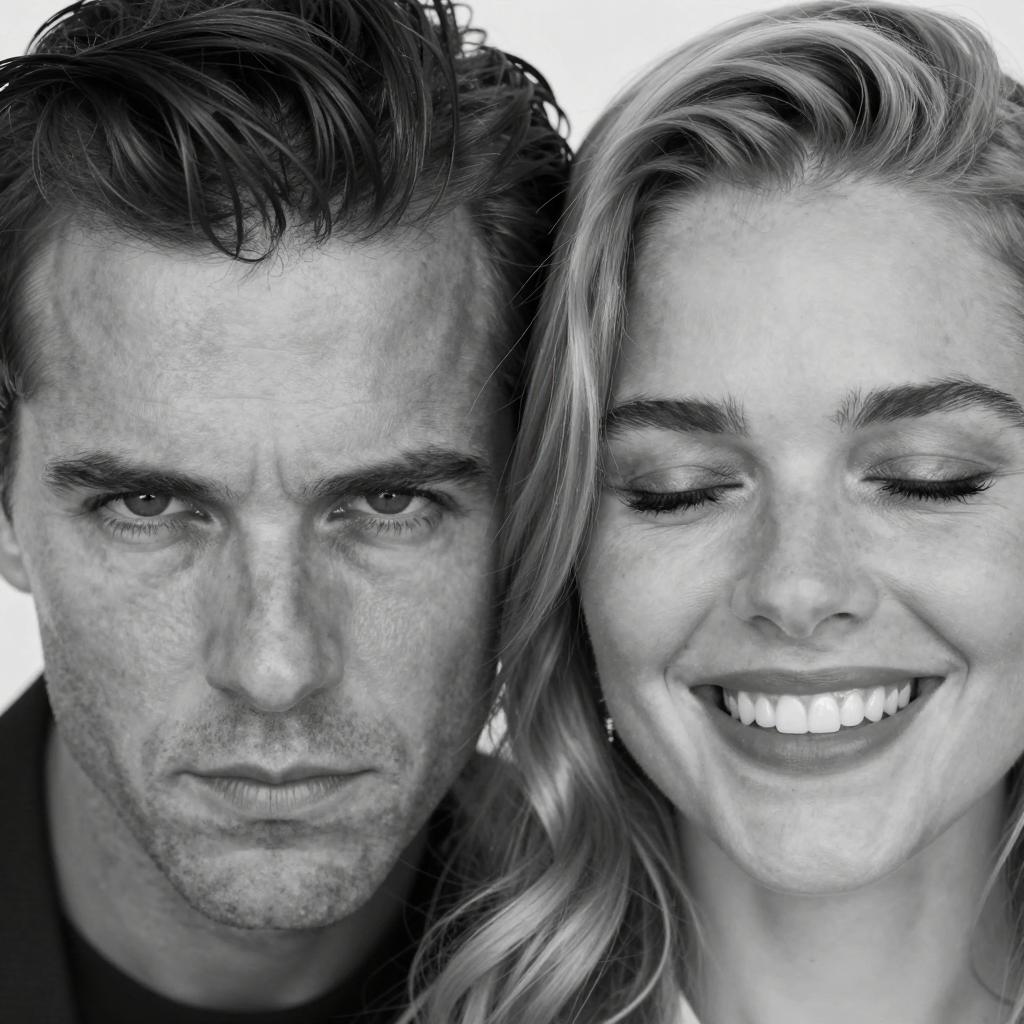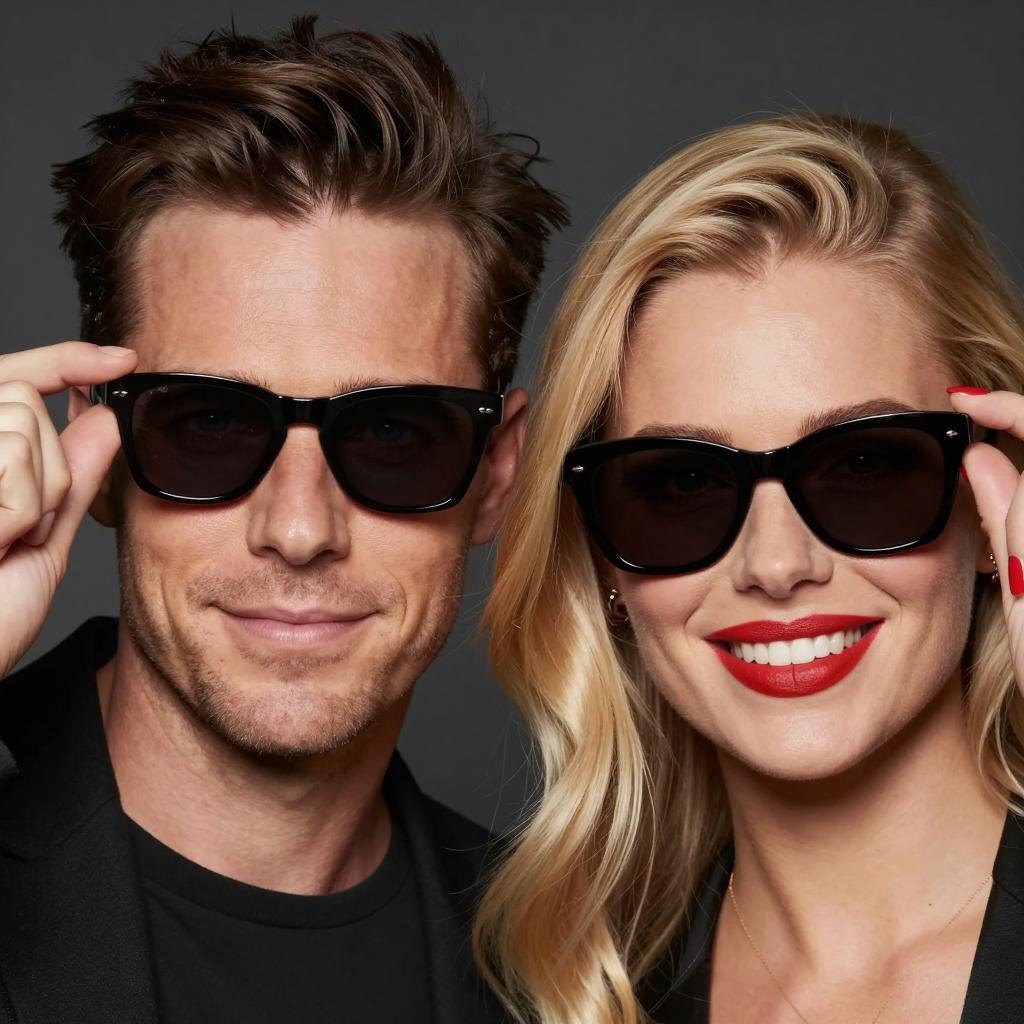 Photograph of a man and a woman wearing black sunglasses with a mirrored image of their faces inside. Man with short dark hair, light skin, blue eyes, and a slight smile. Woman with blonde hair, light skin, red lipstick, and red nails, smiling. Both holding sunglasses up to their eyes. Dark background.