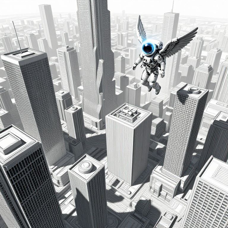 A digital art composition showcasing an intricate, surreal landscape where architecture defies conventional spatial understanding. The scene depicts a futuristic metropolis with skyscrapers folding into themselves, creating a mesmerizing and disorienting visual effect. From a high vantage point above the structures, an enigmatic astronaut adorned with mechanical wings and a luminous sphere for their head gracefully traverses the perplexing geometry, casting intricate shadows across the cityscape below. This image engenders feelings of awe, intrigue, and subtle unease as viewers explore the artistically rendered lines and forms that seem to transcend physical limitations.
