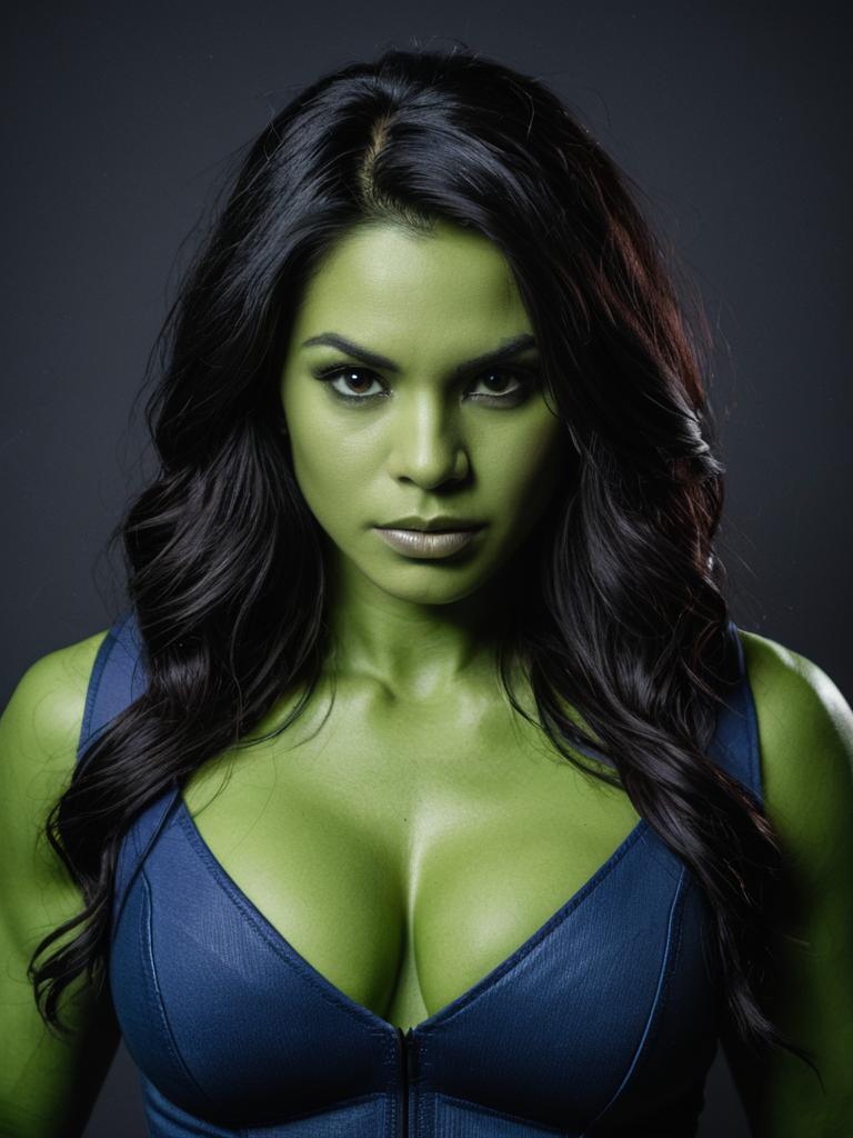 Woman in She Hulk costume, professional cosplay studio headshot