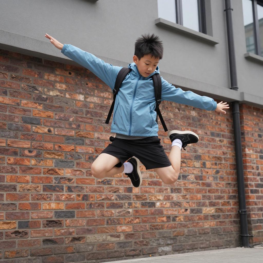 Boy mid-jump against a brick wall, wearing light blue jacket, gray shirt, black shorts, white socks, black shoes, with a black backpack. Background includes gray building with window and black drainpipe. Daylight. High angle view. Outstretched arms, focused expression. Urban setting. One person.