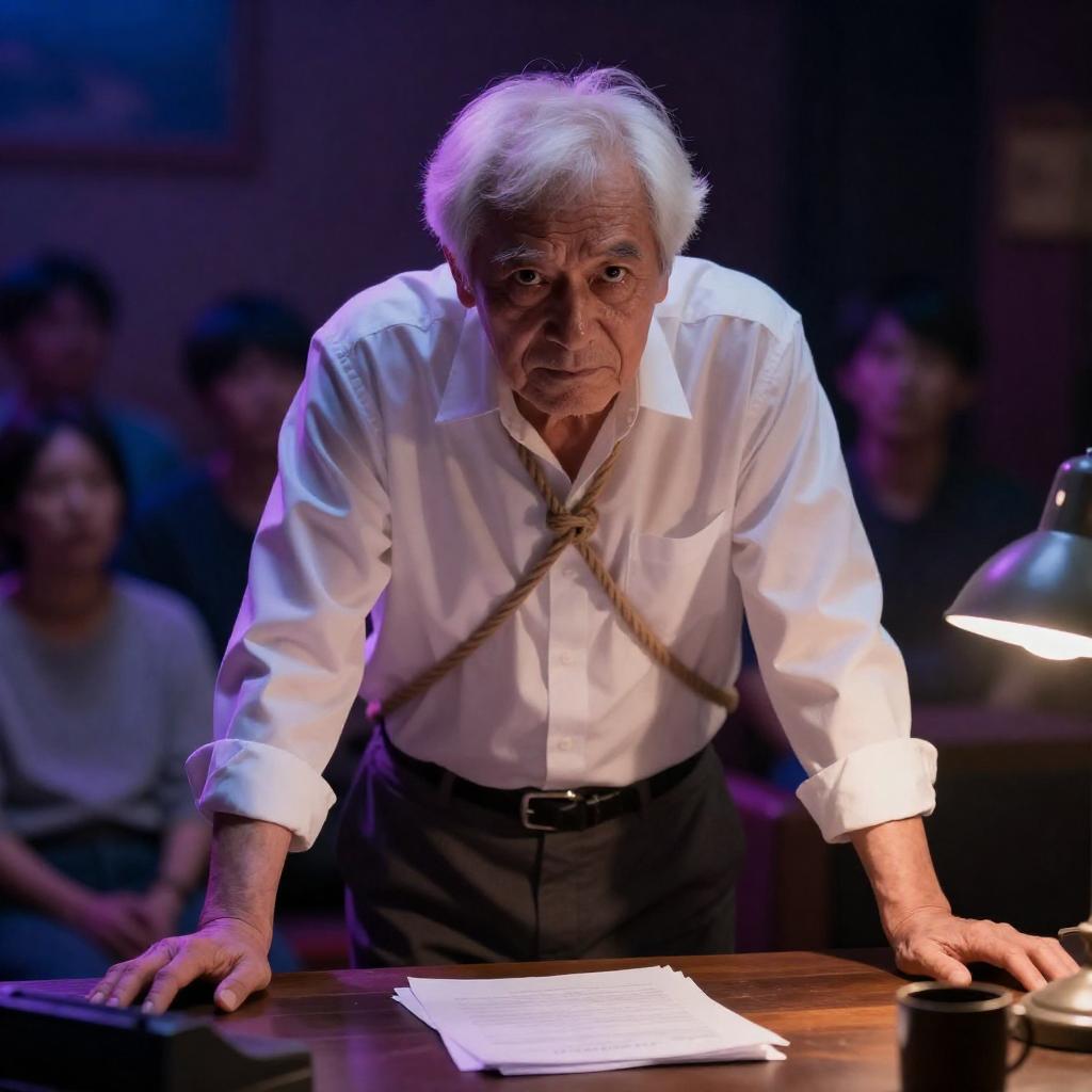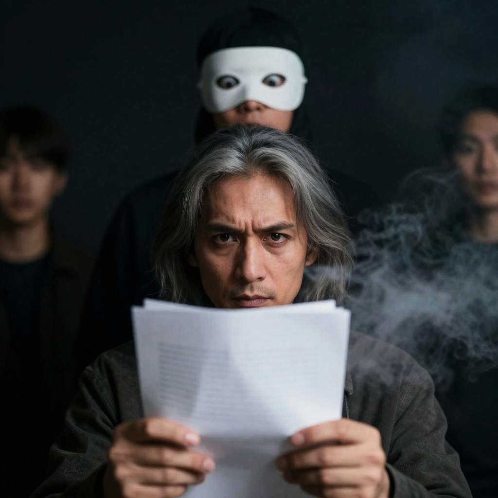 Photograph of a man with long, gray hair, intense expression, holding crumpled papers, partially obscured by dark smoke. Behind him, a masked figure with wide eyes and a shocked expression peeks through the smoke. Two people, dark background.