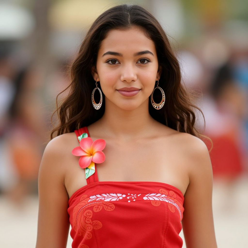 Photograph of a young woman with long dark hair, wearing a red strapless top, large hoop earrings, and a red hibiscus flower