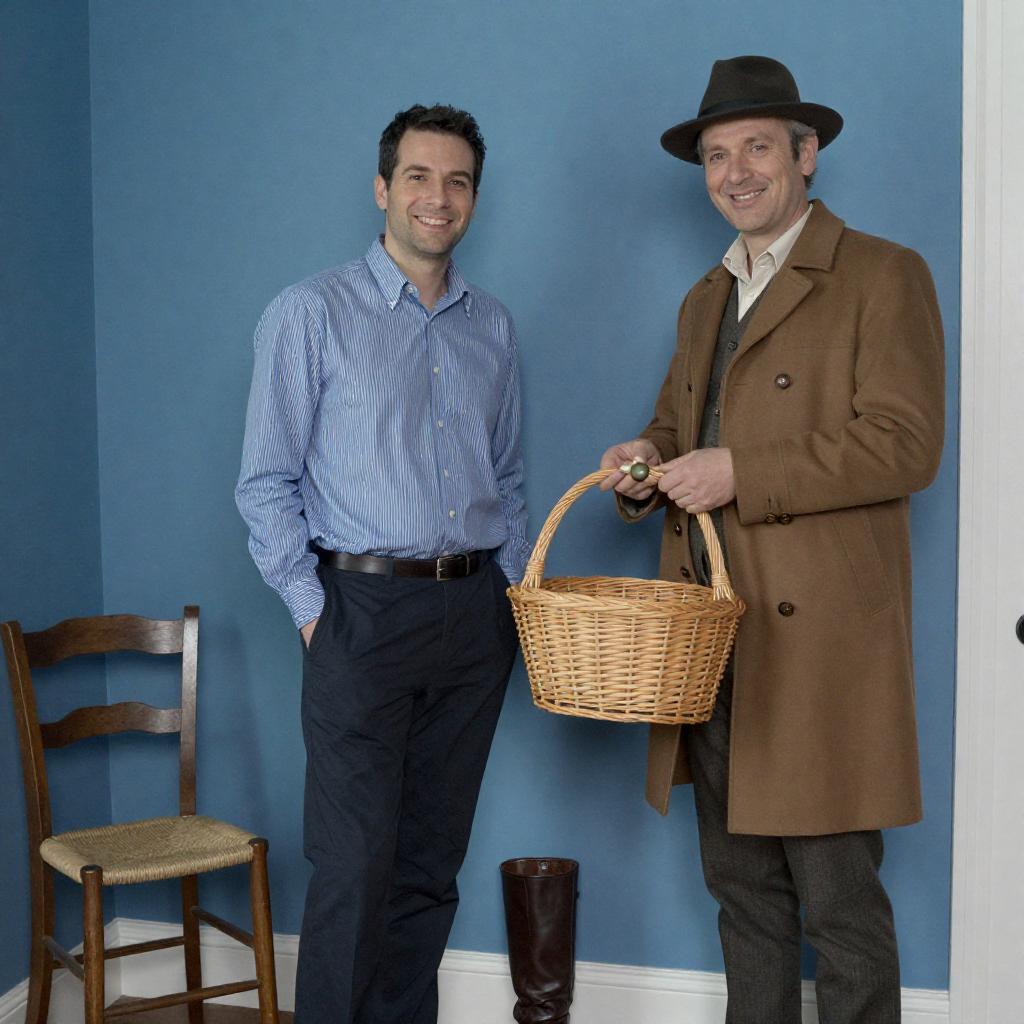 Photograph of two men standing in a blue-walled room. The man on the left, with short dark hair and a striped blue shirt, smiles with hands in pockets. The man on the right, wearing a brown coat, hat, and holding a wicker basket, smiles while holding a small object. A wooden chair and a tall brown boot are in the foreground.