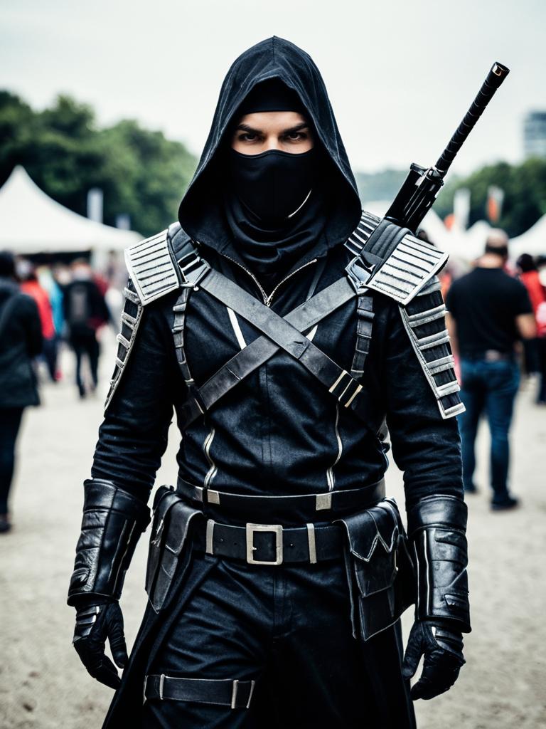 Portrait of a man wearing a modern assassin cosplay costume at a festival. The outfit includes a black hooded jacket with leather straps and armor details, and a black face mask with silver linear accents. The photo was taken in an outdoor urban setting with a blurred crowd and tents in the background.