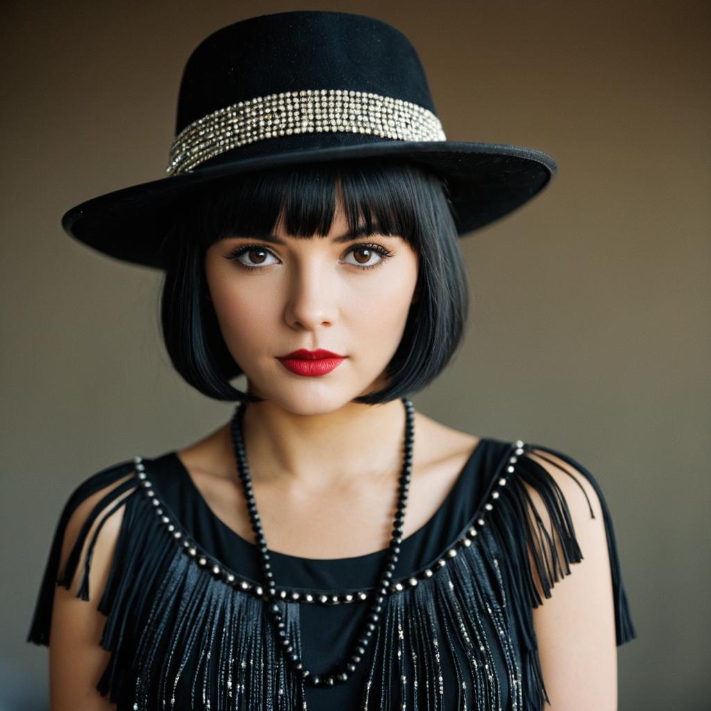 Red flapper dress costume,1girl, solo, dress, jewelry, necklace, red dress, hat, short hair, black hair, realistic